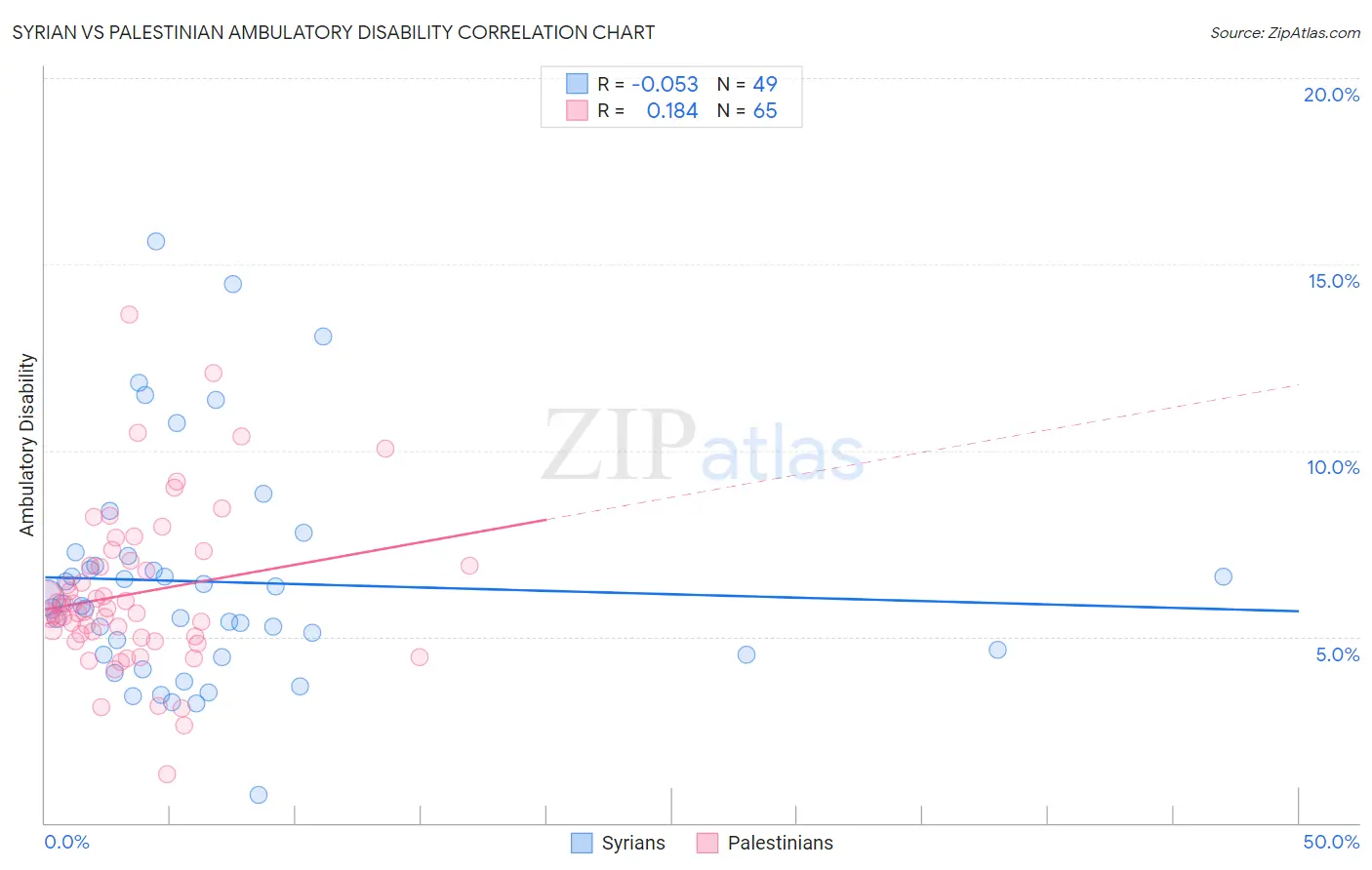 The statistical analysis conducted on geographies consisting of 266,278,347 people shows a slight negative correlation between the proportion of Syrians and percentage of population with ambulatory disability in the United States with a correlation coefficient (R) of -0.053 and weighted average of 6.0%. Similarly, the statistical analysis conducted on geographies consisting of 216,450,834 people shows a poor positive correlation between the proportion of Palestinians and percentage of population with ambulatory disability in the United States with a correlation coefficient (R) of 0.184 and weighted average of 5.7%, a difference of 5.2%.