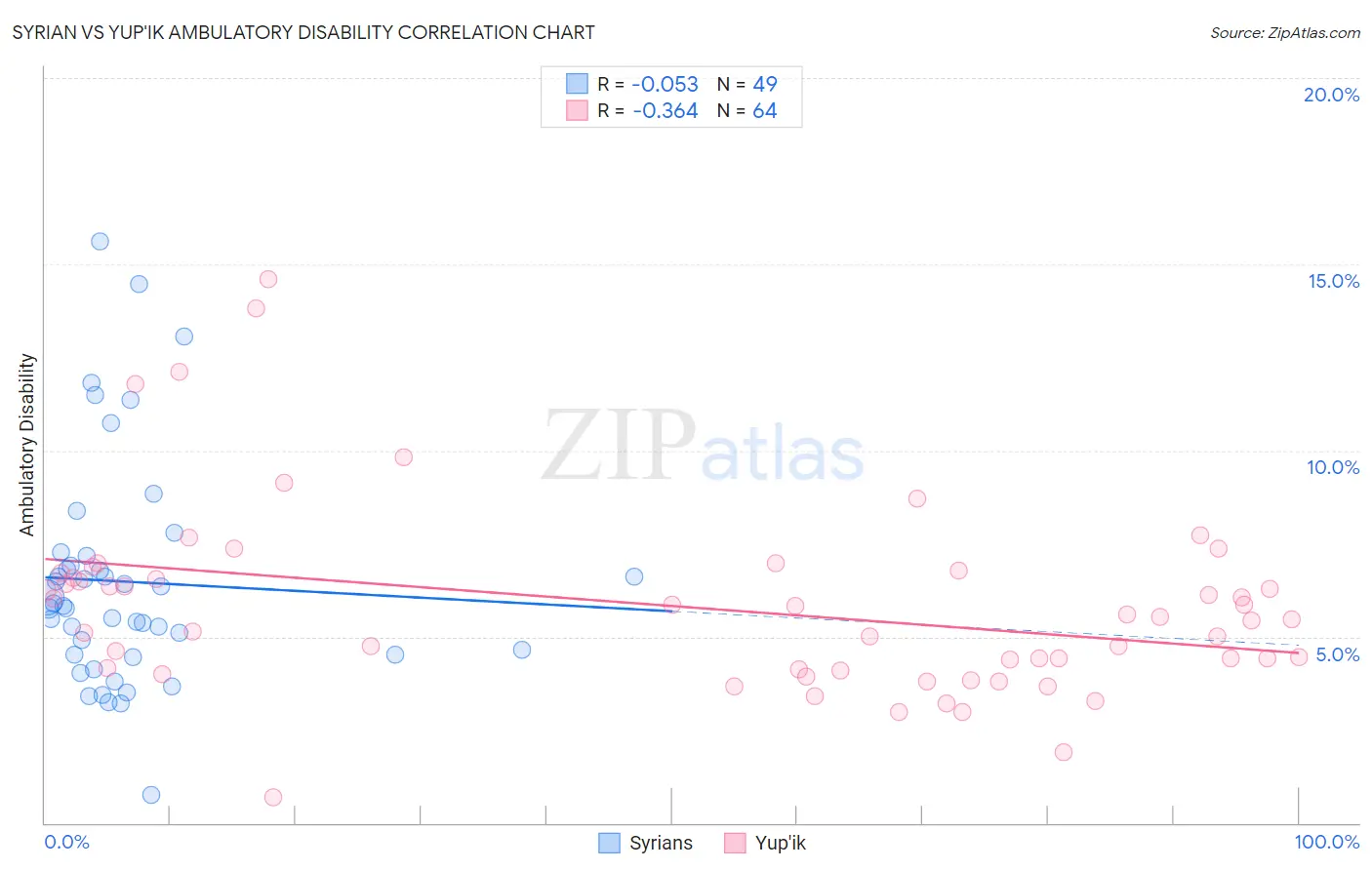 The statistical analysis conducted on geographies consisting of 266,278,347 people shows a slight negative correlation between the proportion of Syrians and percentage of population with ambulatory disability in the United States with a correlation coefficient (R) of -0.053 and weighted average of 6.0%. Similarly, the statistical analysis conducted on geographies consisting of 39,959,471 people shows a mild negative correlation between the proportion of Yup'ik and percentage of population with ambulatory disability in the United States with a correlation coefficient (R) of -0.364 and weighted average of 5.2%, a difference of 16.9%.