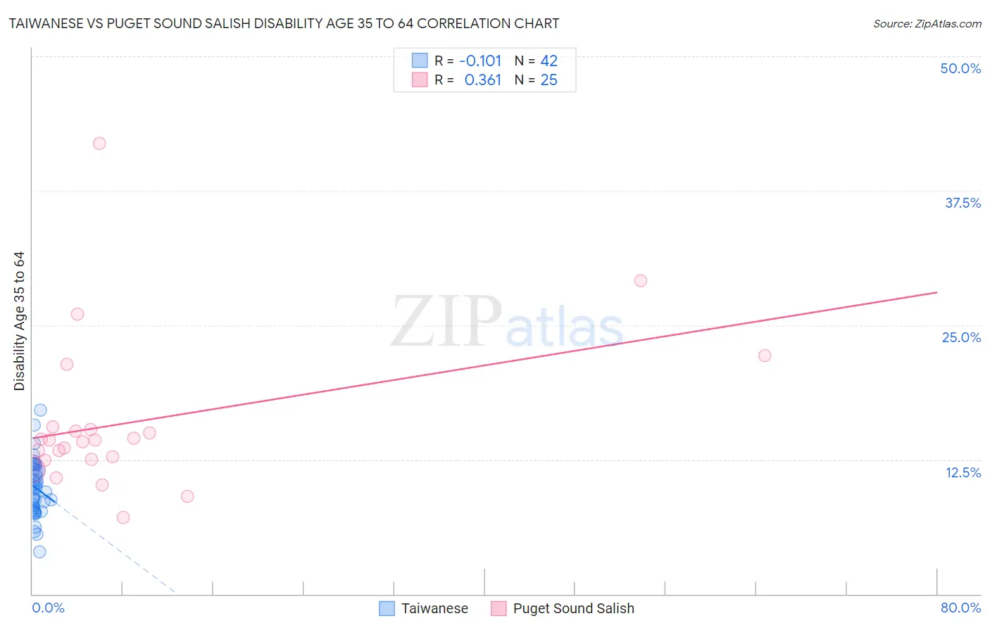 Taiwanese vs Puget Sound Salish Disability Age 35 to 64 Correlation Chart