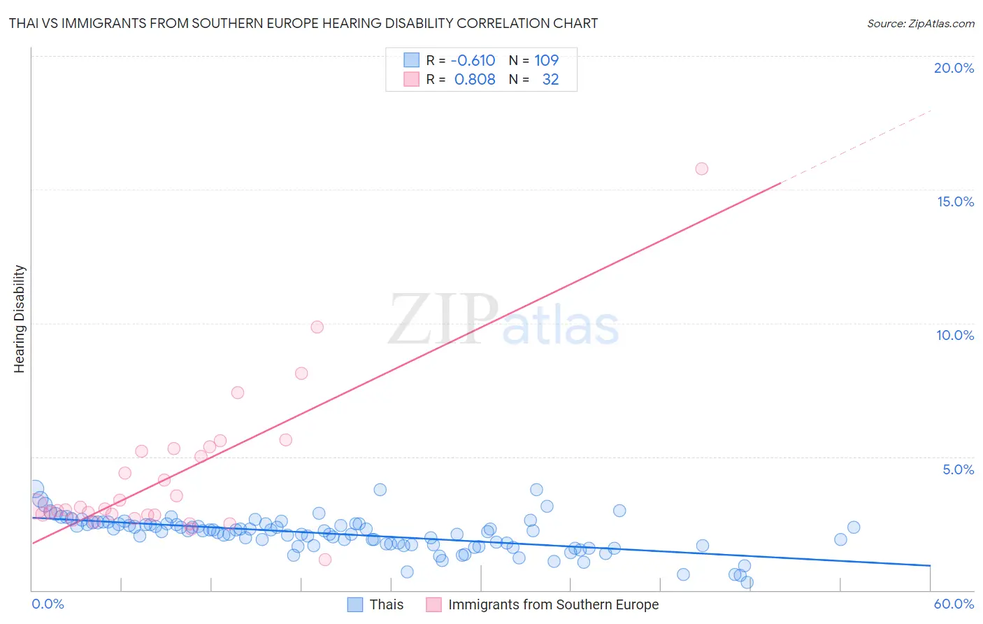 Thai vs Immigrants from Southern Europe Hearing Disability Correlation Chart