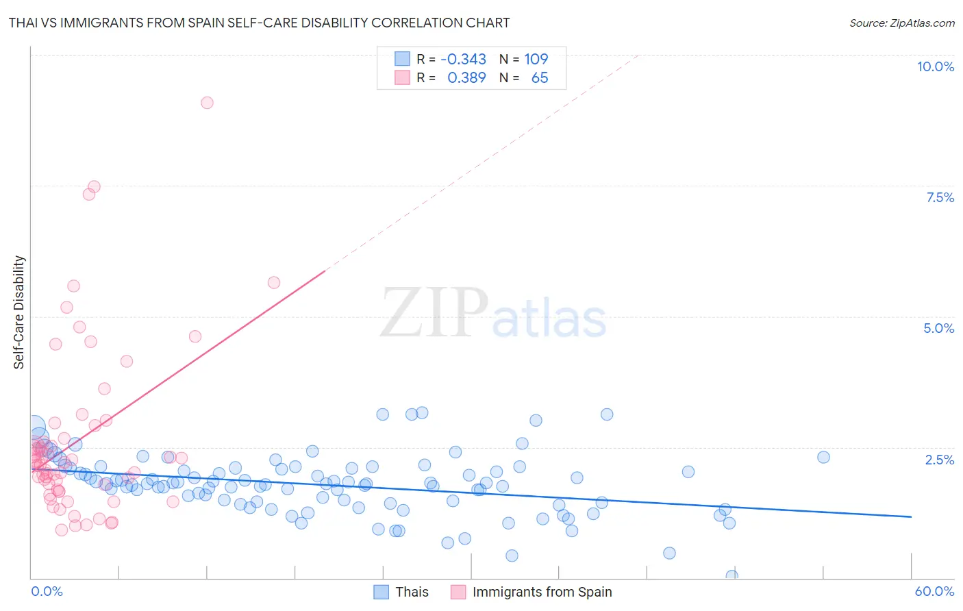 Thai vs Immigrants from Spain Self-Care Disability Correlation Chart