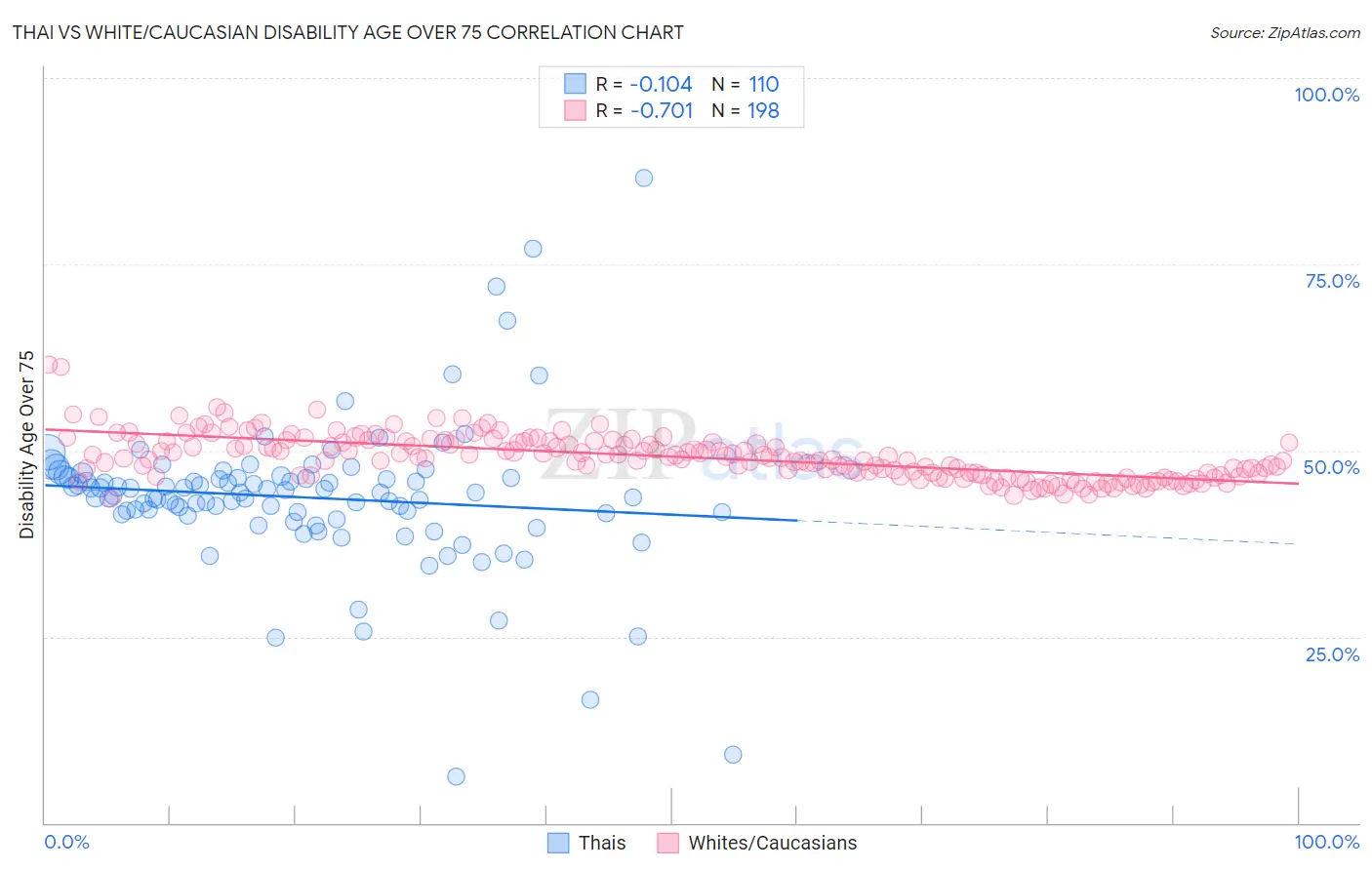 Thai vs White/Caucasian Disability Age Over 75 Correlation Chart
