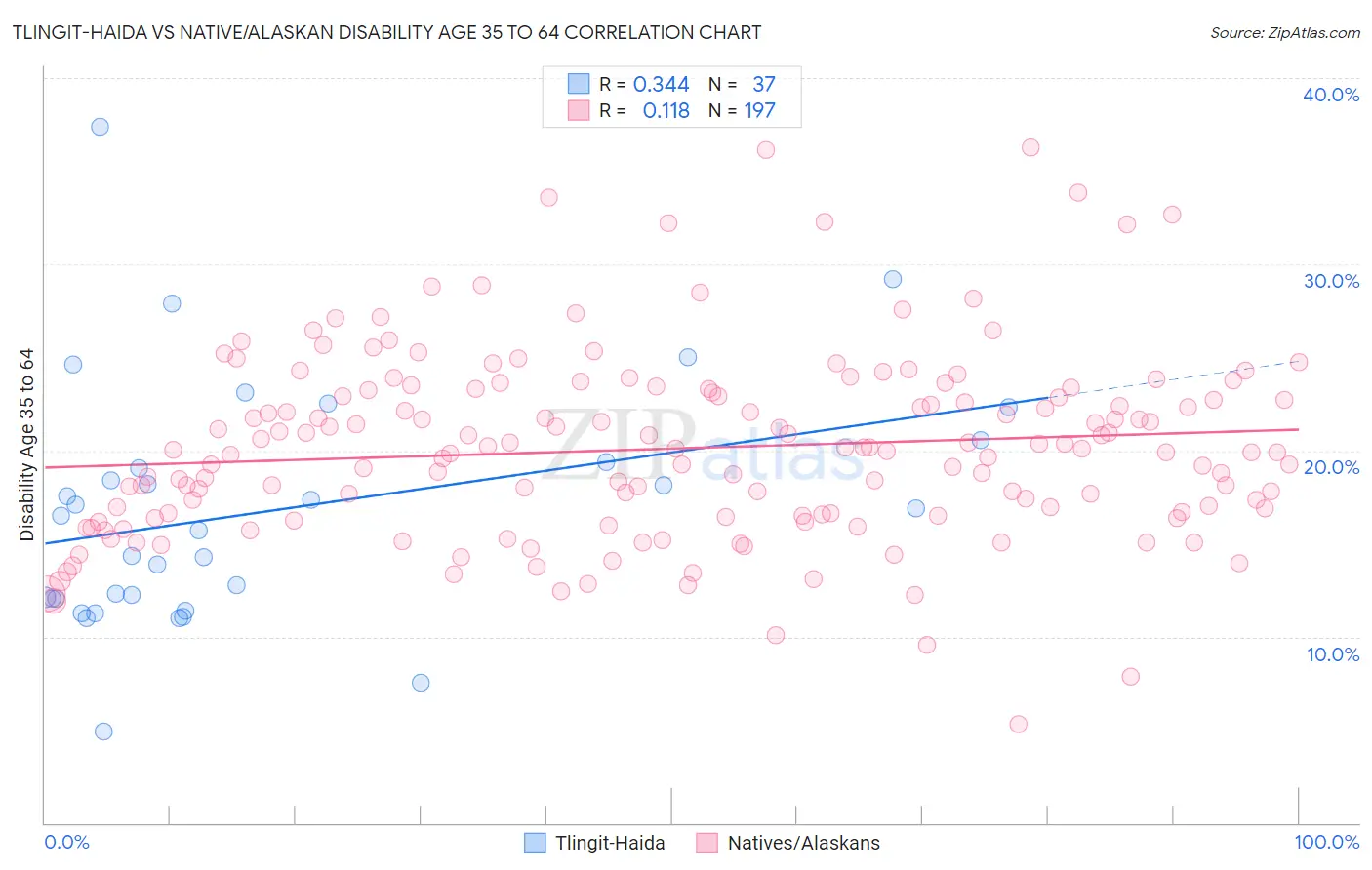 The statistical analysis conducted on geographies consisting of 60,853,720 people shows a mild positive correlation between the proportion of Tlingit-Haida and percentage of population with a disability between the ages 34 and 64 in the United States with a correlation coefficient (R) of 0.344 and weighted average of 13.2%. Similarly, the statistical analysis conducted on geographies consisting of 512,516,181 people shows a poor positive correlation between the proportion of Natives/Alaskans and percentage of population with a disability between the ages 34 and 64 in the United States with a correlation coefficient (R) of 0.118 and weighted average of 15.3%, a difference of 16.2%.