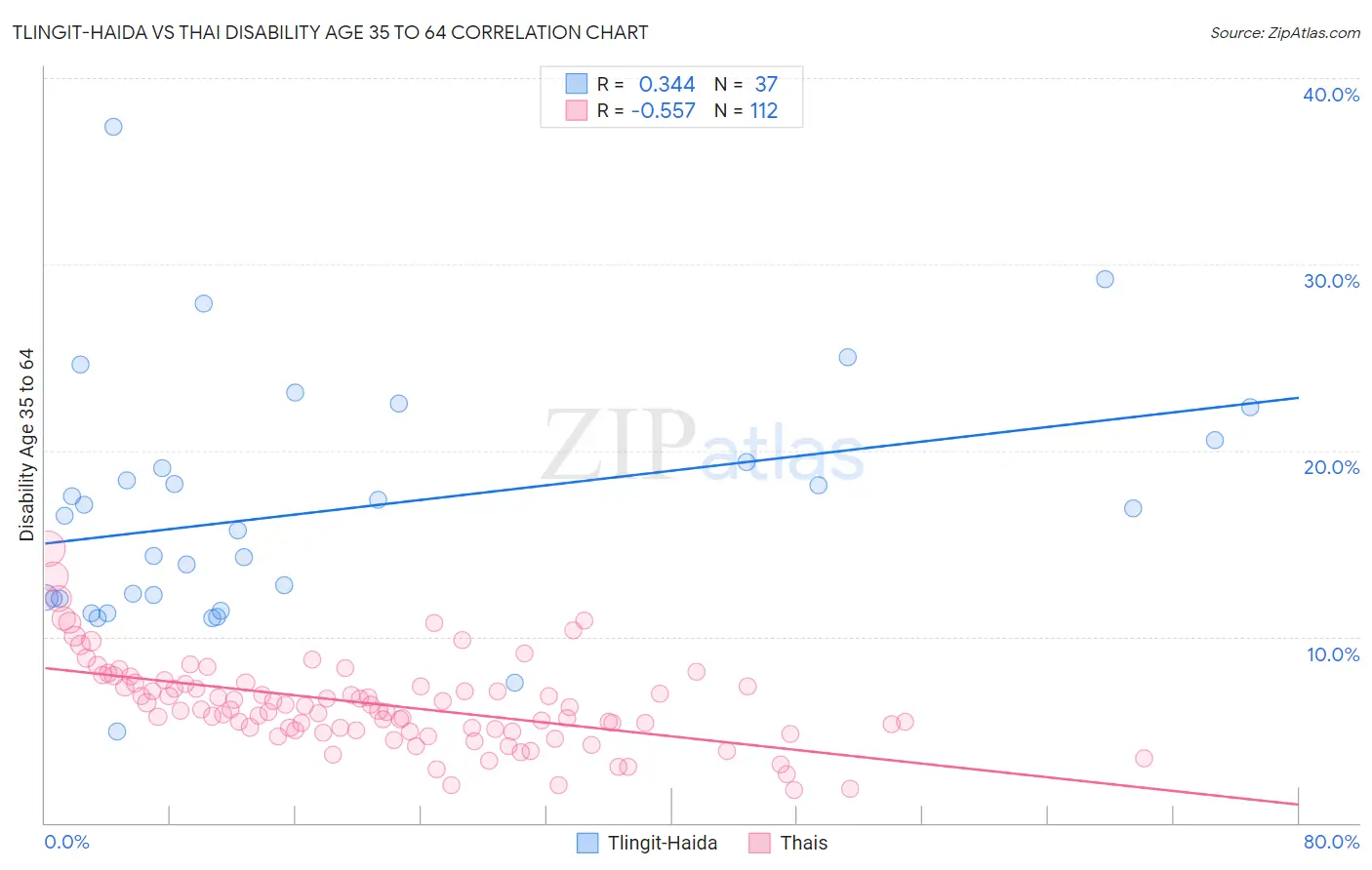 Tlingit-Haida vs Thai Disability Age 35 to 64 Correlation Chart