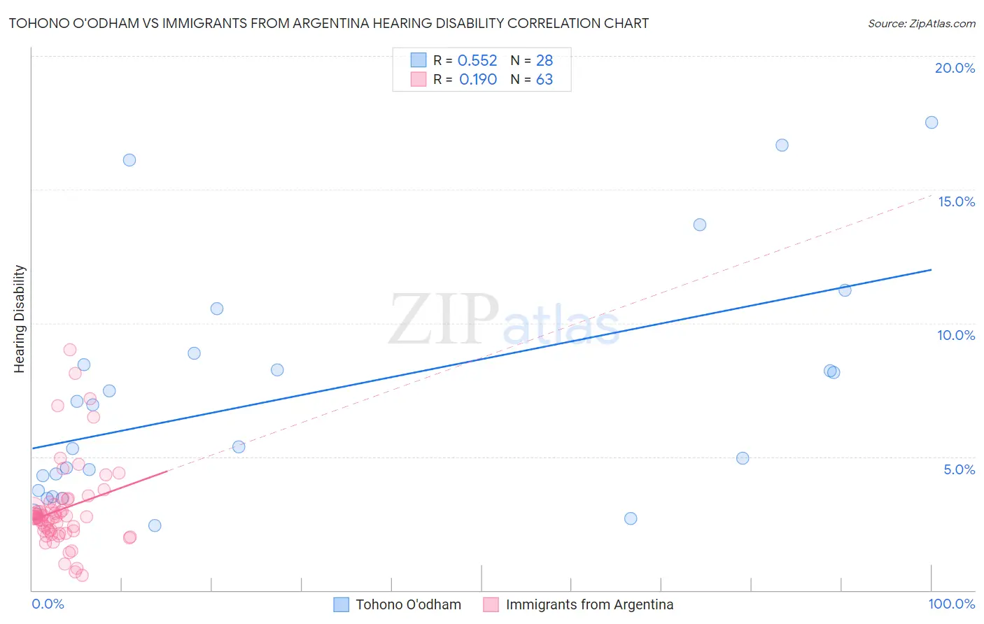 Tohono O'odham vs Immigrants from Argentina Hearing Disability Correlation Chart