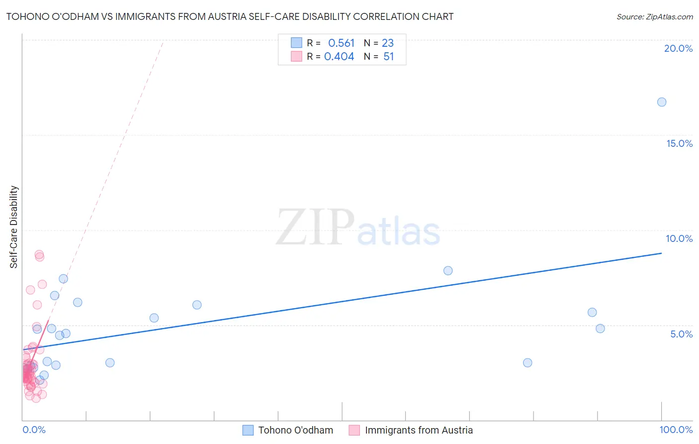 Tohono O'odham vs Immigrants from Austria Self-Care Disability Correlation Chart