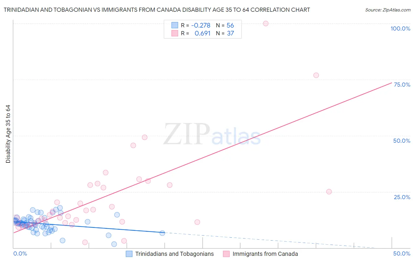 Trinidadian and Tobagonian vs Immigrants from Canada Disability Age 35 to 64 Correlation Chart