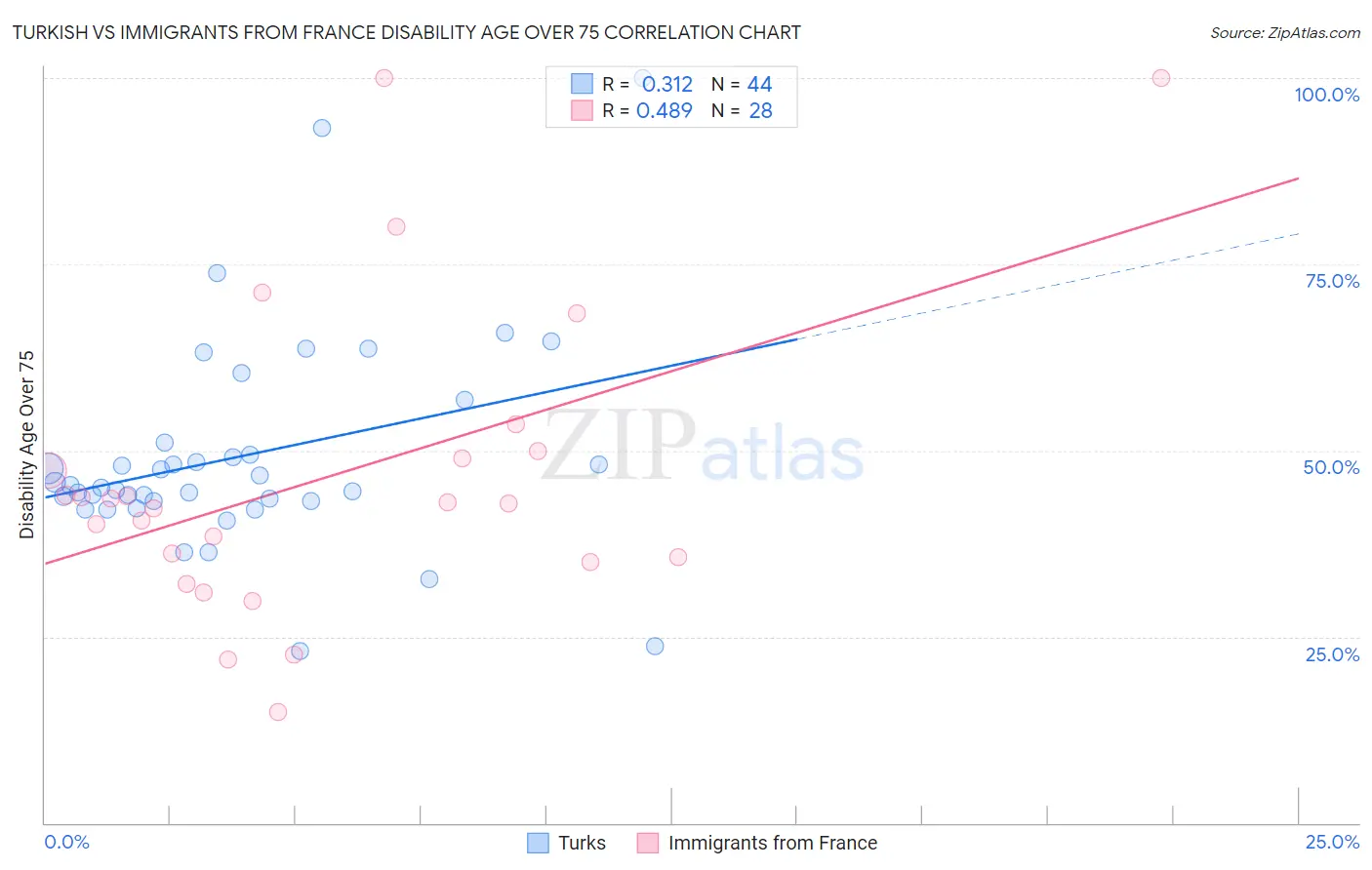 Turkish vs Immigrants from France Disability Age Over 75 Correlation Chart