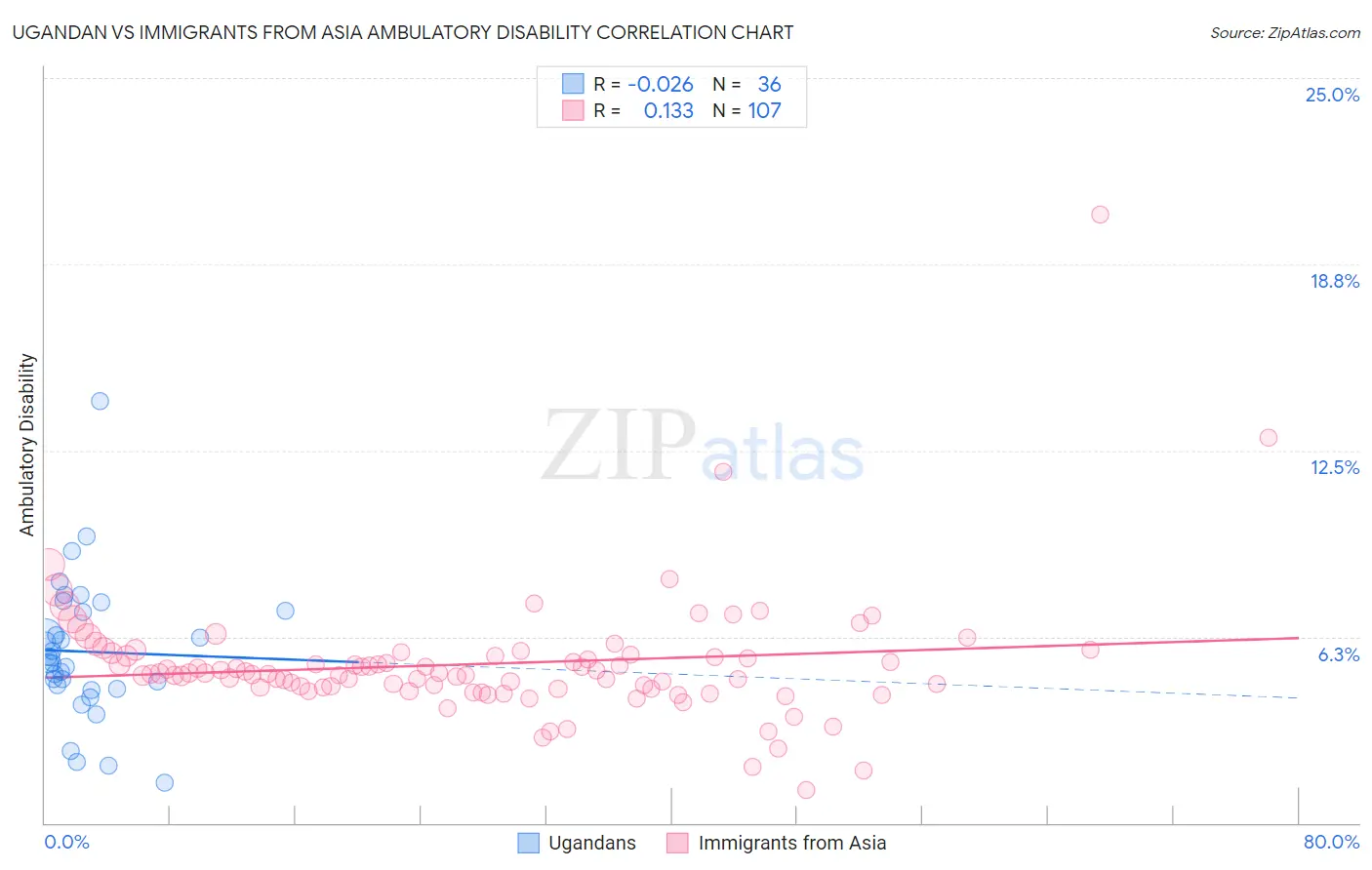 Ugandan vs Immigrants from Asia Ambulatory Disability Correlation Chart