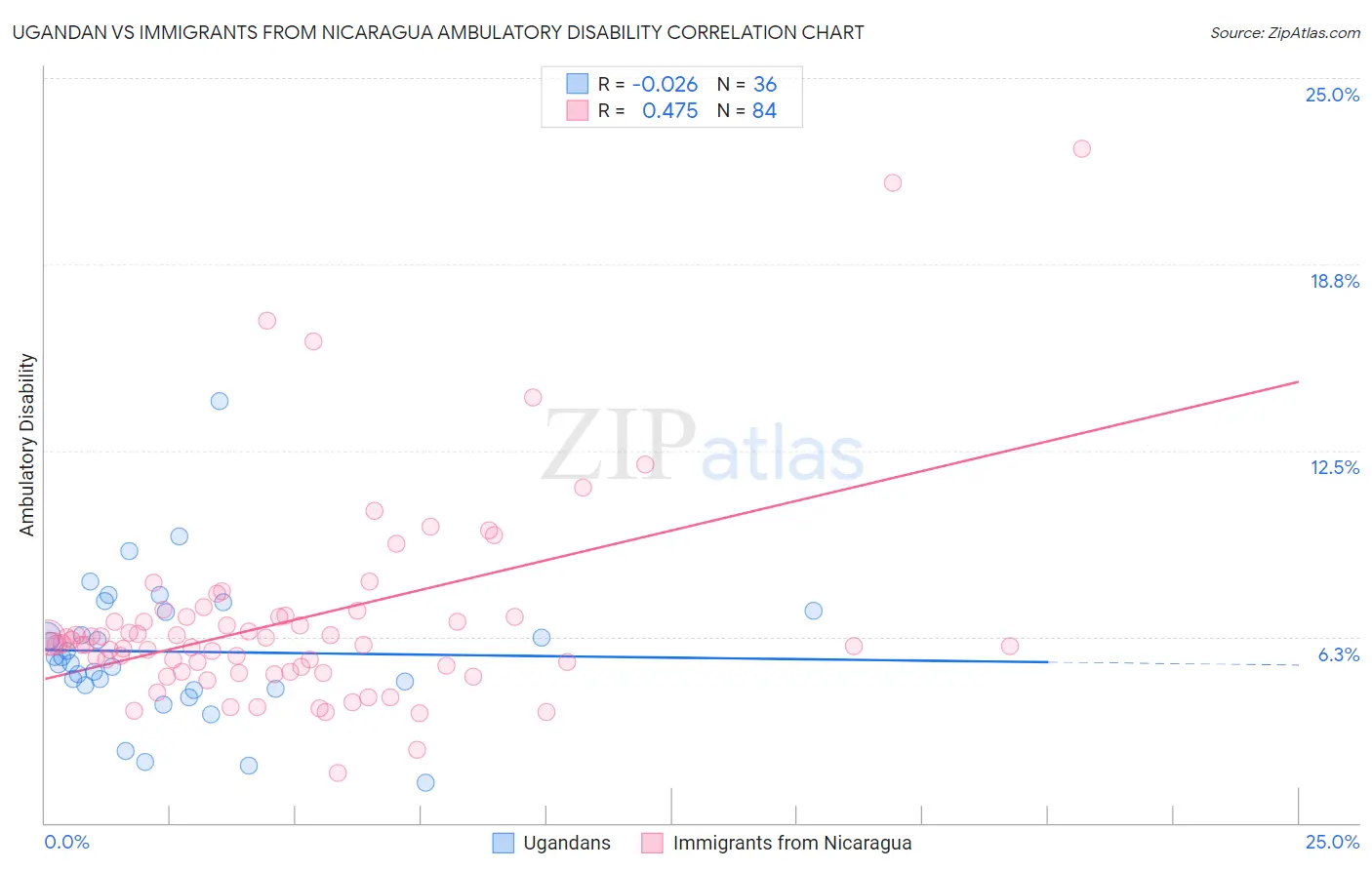 Ugandan vs Immigrants from Nicaragua Ambulatory Disability Correlation Chart