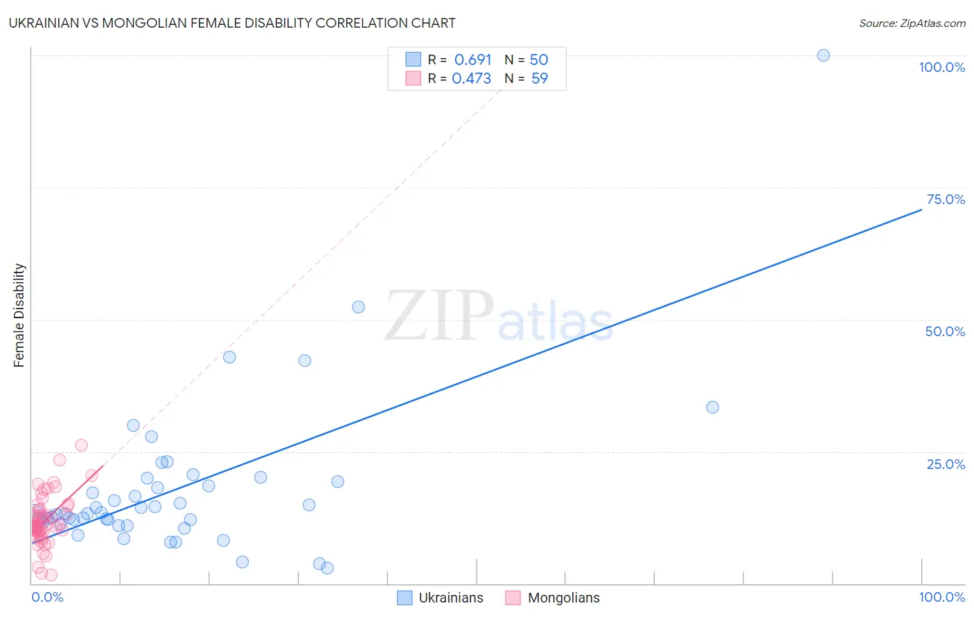 Ukrainian vs Mongolian Female Disability Correlation Chart
