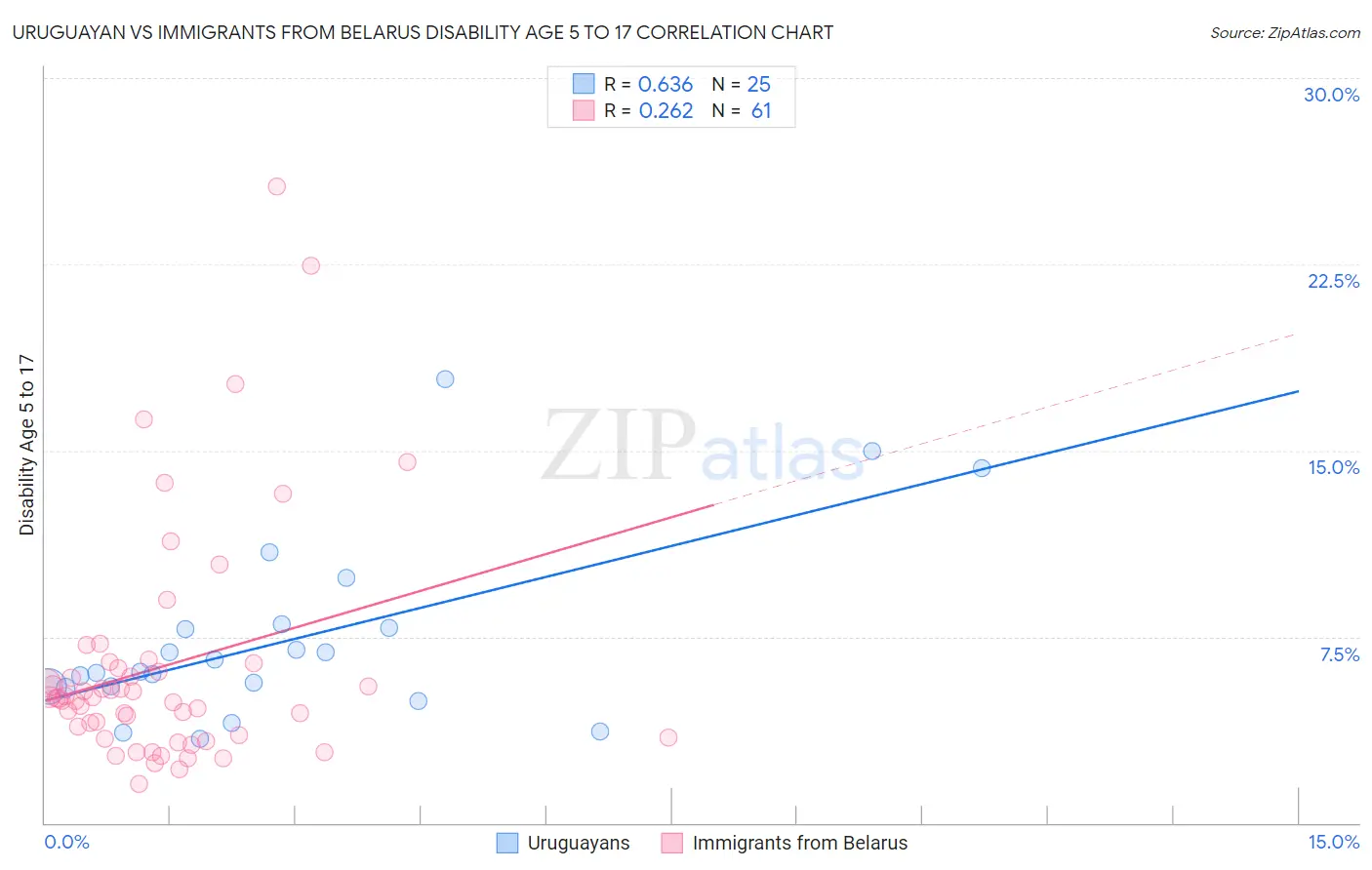 Uruguayan vs Immigrants from Belarus Disability Age 5 to 17 Correlation Chart