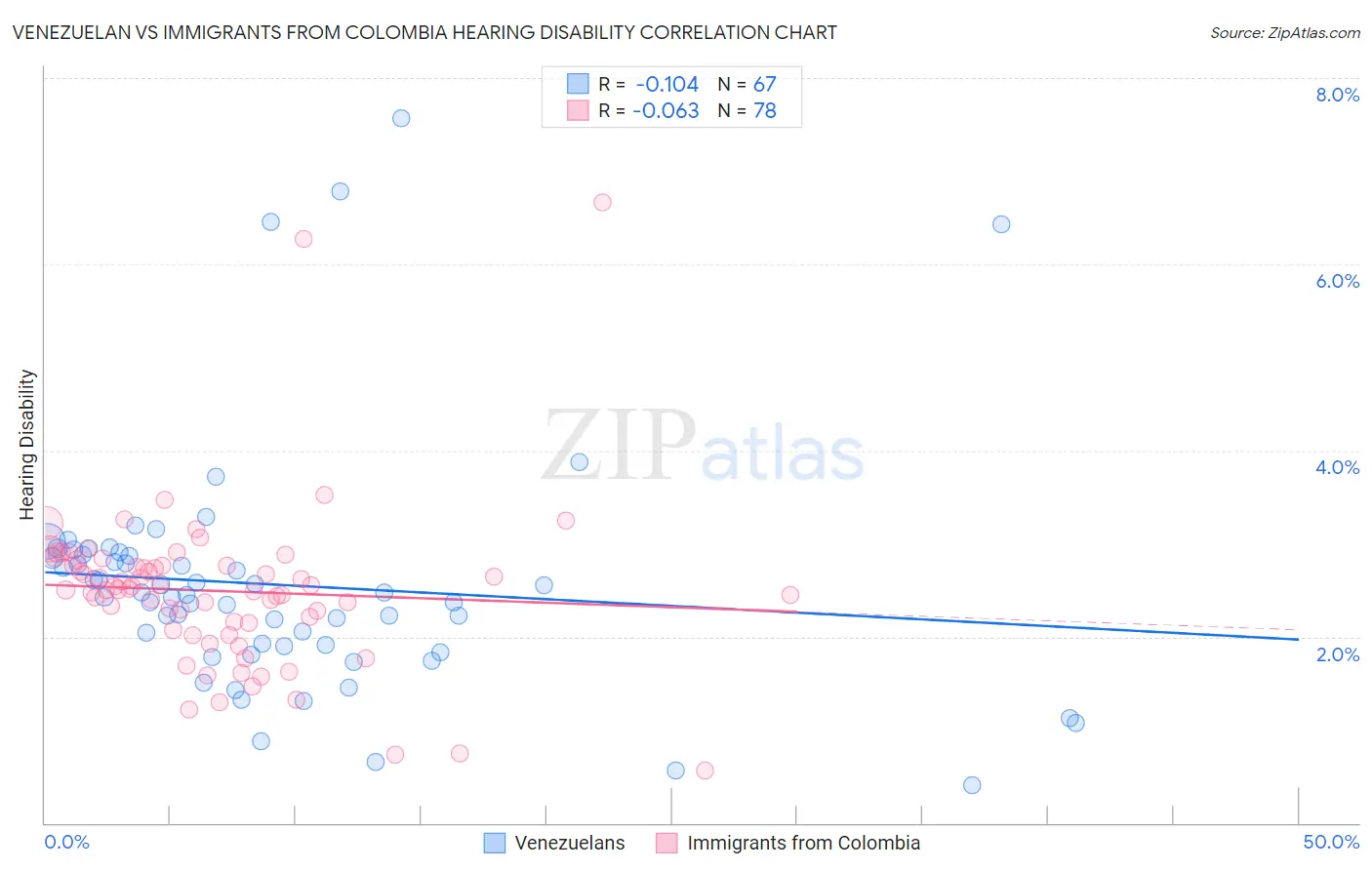 Venezuelan vs Immigrants from Colombia Hearing Disability Correlation Chart