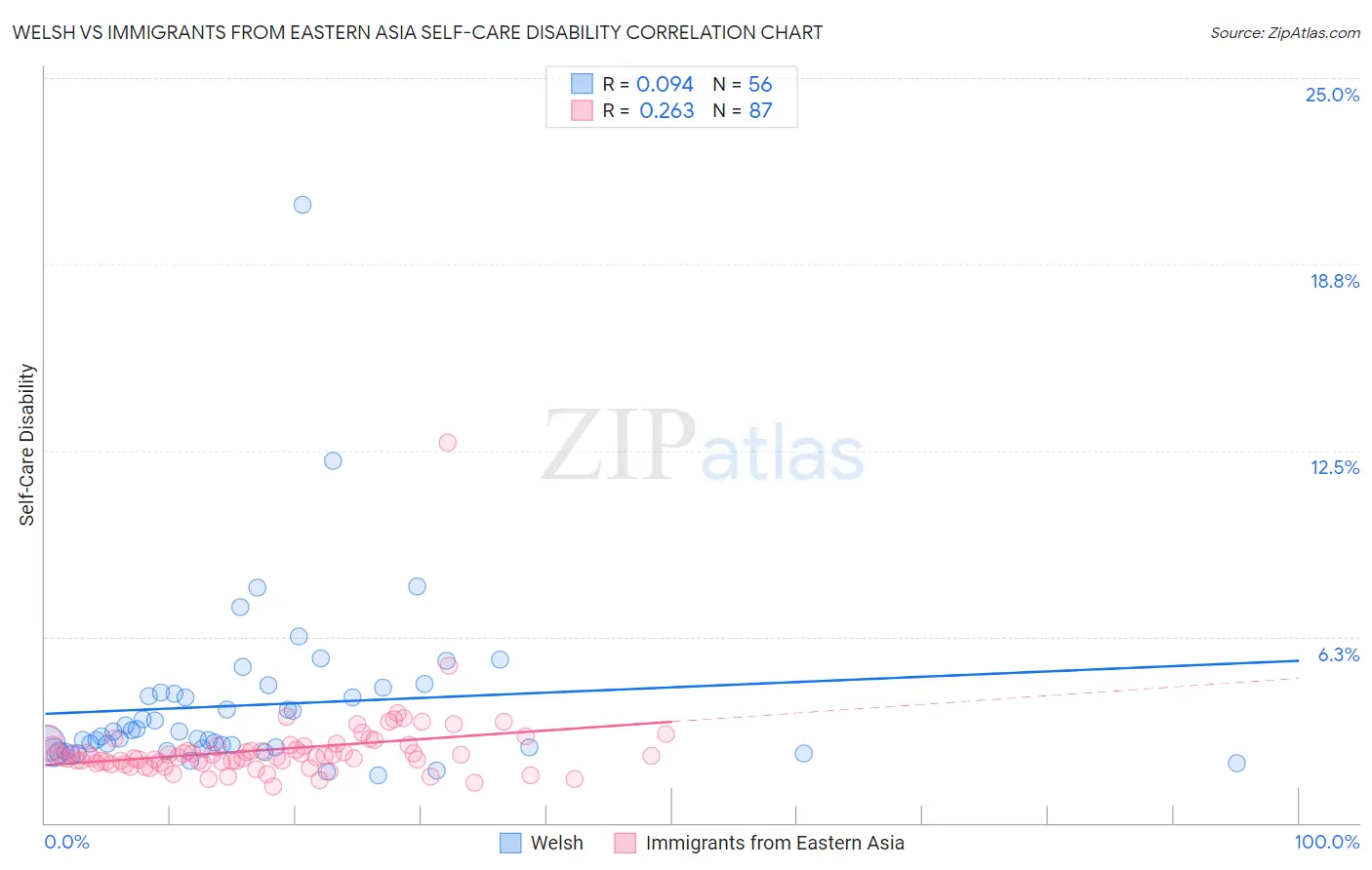 Welsh vs Immigrants from Eastern Asia Self-Care Disability Correlation Chart