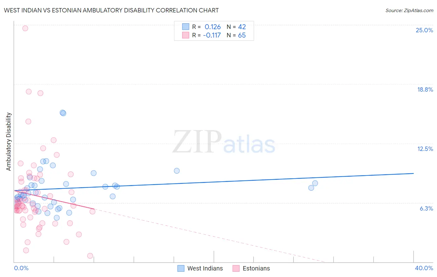 The statistical analysis conducted on geographies consisting of 253,984,061 people shows a poor positive correlation between the proportion of West Indians and percentage of population with ambulatory disability in the United States with a correlation coefficient (R) of 0.126 and weighted average of 6.9%. Similarly, the statistical analysis conducted on geographies consisting of 123,516,931 people shows a poor negative correlation between the proportion of Estonians and percentage of population with ambulatory disability in the United States with a correlation coefficient (R) of -0.117 and weighted average of 5.9%, a difference of 16.3%.