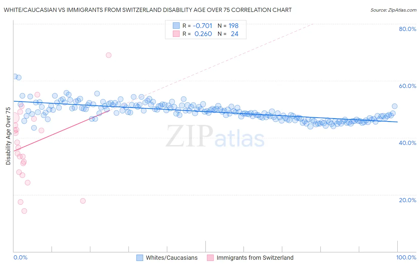 White/Caucasian vs Immigrants from Switzerland Disability Age Over 75 Correlation Chart