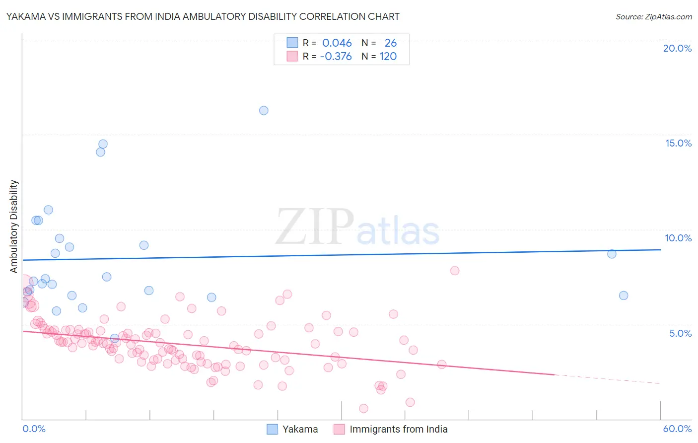 Yakama vs Immigrants from India Ambulatory Disability Correlation Chart