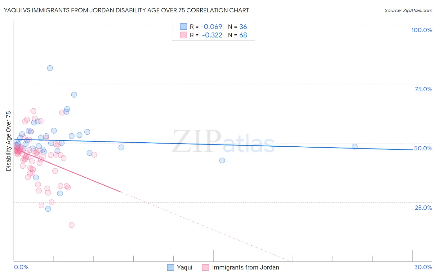 Yaqui vs Immigrants from Jordan Disability Age Over 75 Correlation Chart
