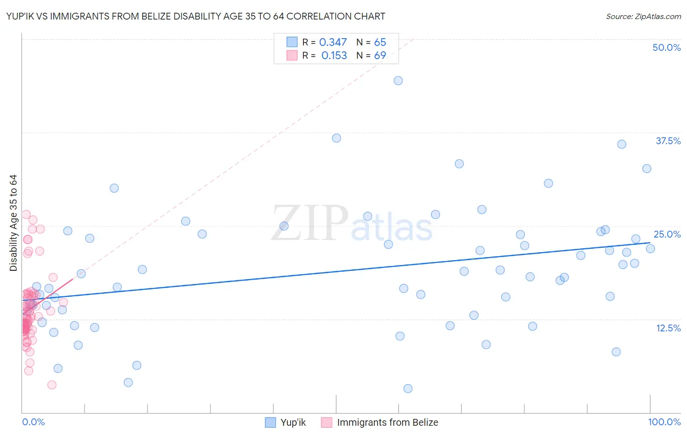 Yup'ik vs Immigrants from Belize Disability Age 35 to 64 Correlation Chart