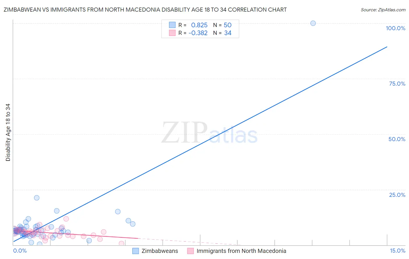 Zimbabwean vs Immigrants from North Macedonia Disability Age 18 to 34 Correlation Chart