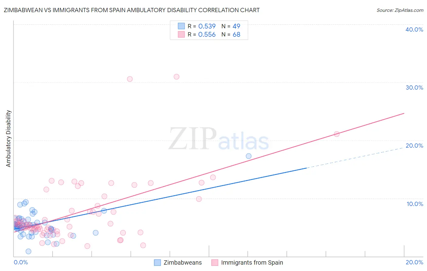 Zimbabwean vs Immigrants from Spain Ambulatory Disability Correlation Chart