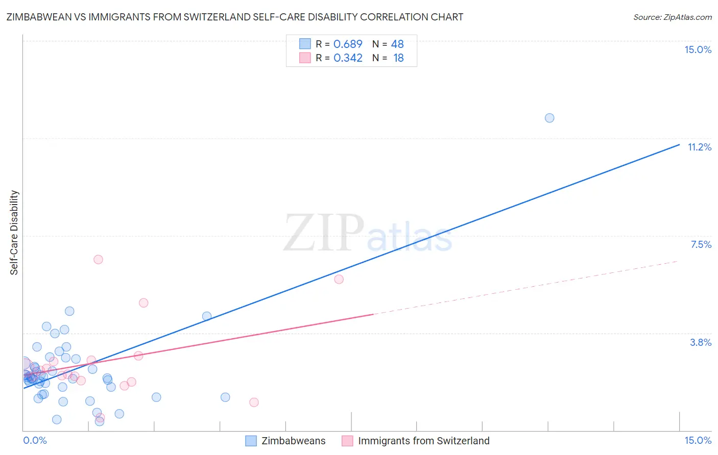 Zimbabwean vs Immigrants from Switzerland Self-Care Disability Correlation Chart
