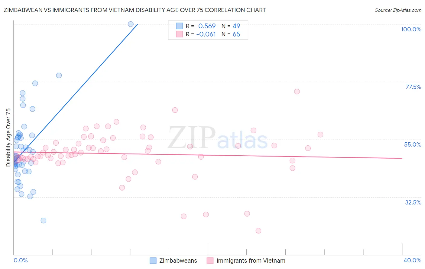 Zimbabwean vs Immigrants from Vietnam Disability Age Over 75 Correlation Chart