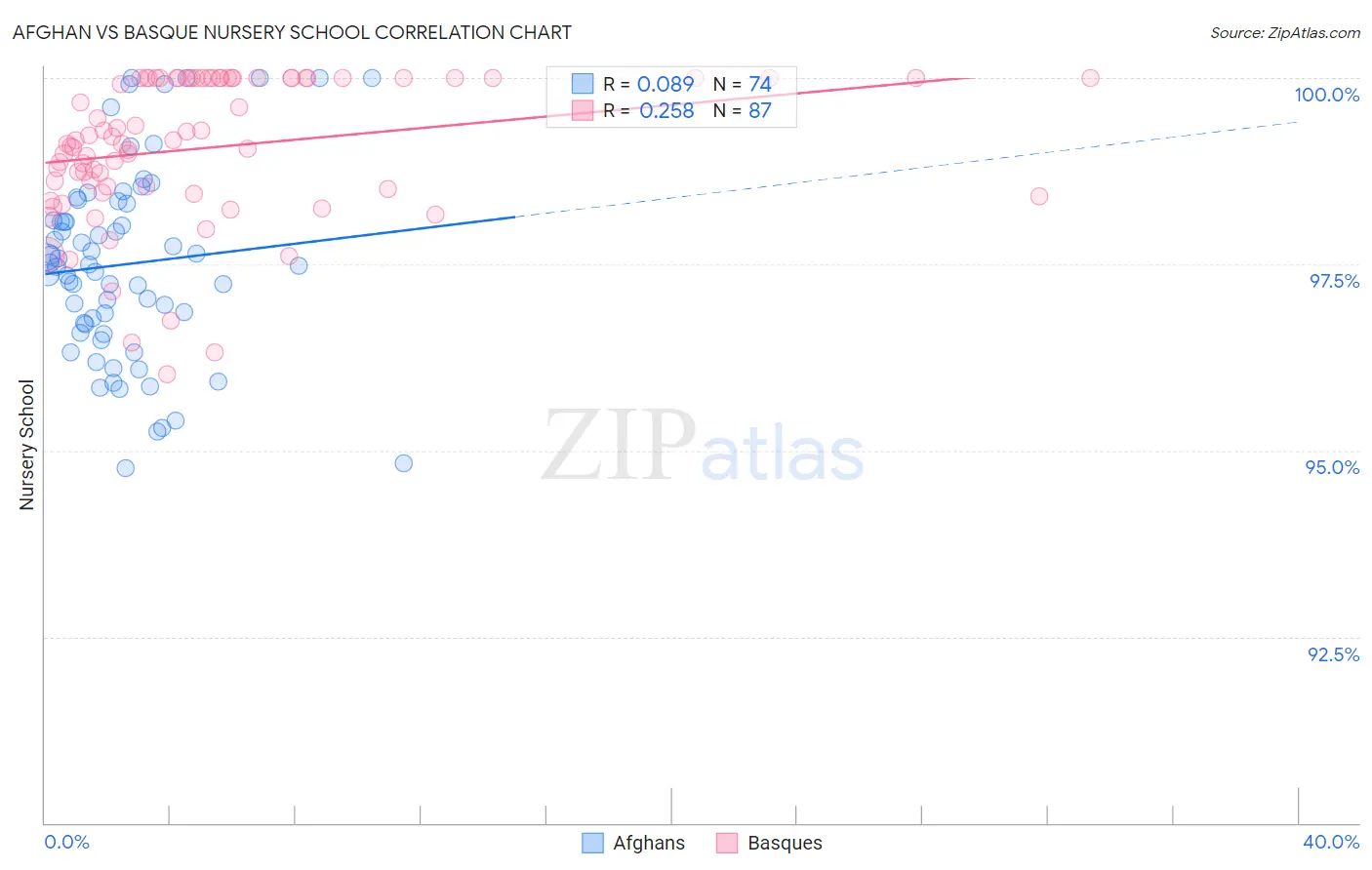The statistical analysis conducted on geographies consisting of 148,851,685 people shows a slight positive correlation between the proportion of Afghans and percentage of population with at least nursery school education in the United States with a correlation coefficient (R) of 0.089 and weighted average of 97.4%. Similarly, the statistical analysis conducted on geographies consisting of 165,774,137 people shows a weak positive correlation between the proportion of Basques and percentage of population with at least nursery school education in the United States with a correlation coefficient (R) of 0.258 and weighted average of 98.2%, a difference of 0.85%.