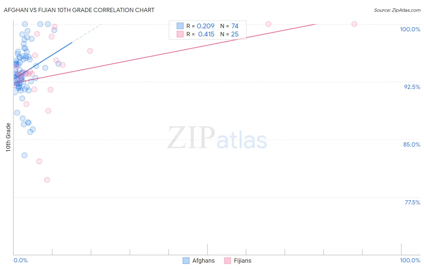 The statistical analysis conducted on geographies consisting of 148,851,685 people shows a weak positive correlation between the proportion of Afghans and percentage of population with at least 10th grade education in the United States with a correlation coefficient (R) of 0.209 and weighted average of 93.1%. Similarly, the statistical analysis conducted on geographies consisting of 55,948,842 people shows a moderate positive correlation between the proportion of Fijians and percentage of population with at least 10th grade education in the United States with a correlation coefficient (R) of 0.415 and weighted average of 91.5%, a difference of 1.7%.