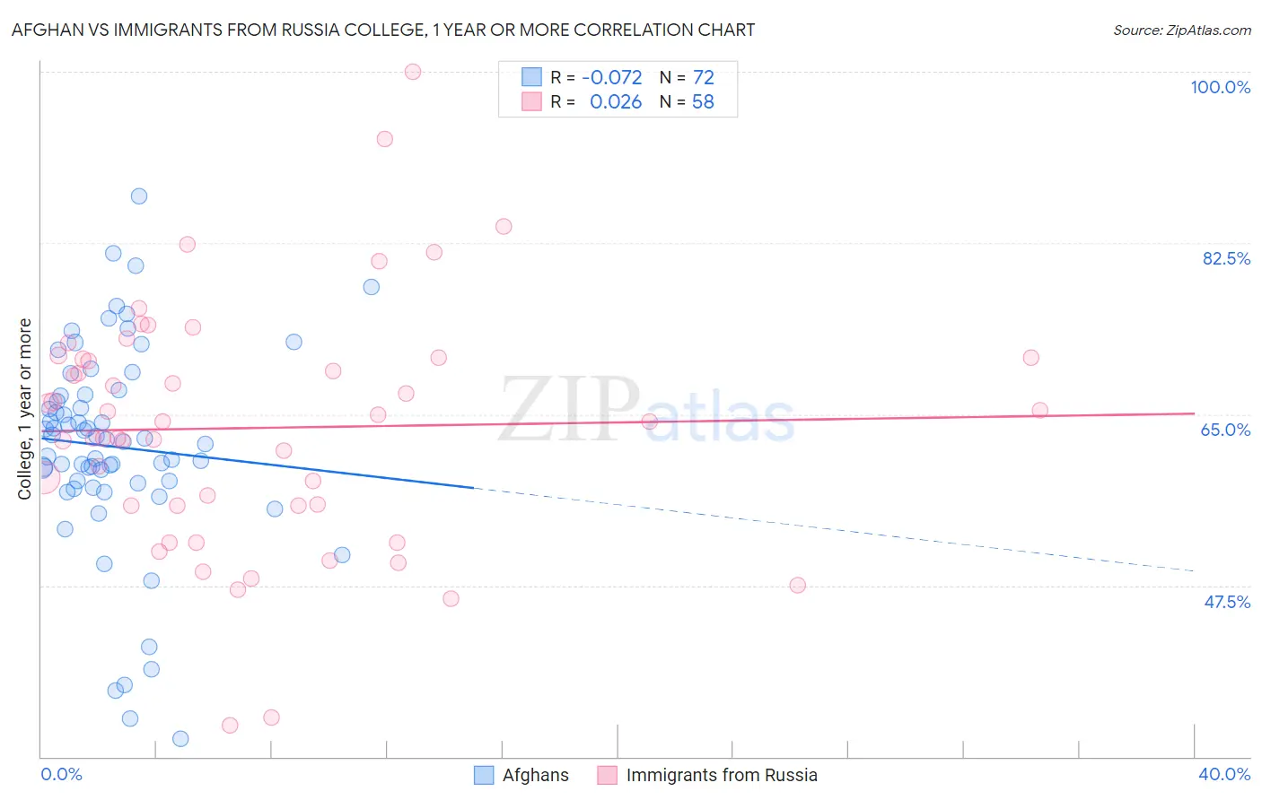 Afghan vs Immigrants from Russia College, 1 year or more Correlation Chart