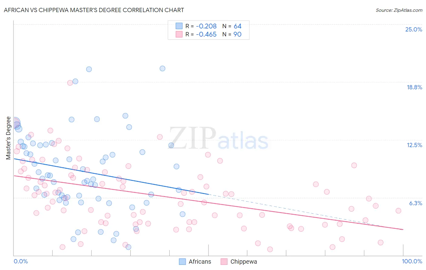 The statistical analysis conducted on geographies consisting of 469,751,464 people shows a weak negative correlation between the proportion of Africans and percentage of population with at least master's degree education in the United States with a correlation coefficient (R) of -0.208 and weighted average of 12.9%. Similarly, the statistical analysis conducted on geographies consisting of 215,015,908 people shows a moderate negative correlation between the proportion of Chippewa and percentage of population with at least master's degree education in the United States with a correlation coefficient (R) of -0.465 and weighted average of 11.4%, a difference of 12.8%.