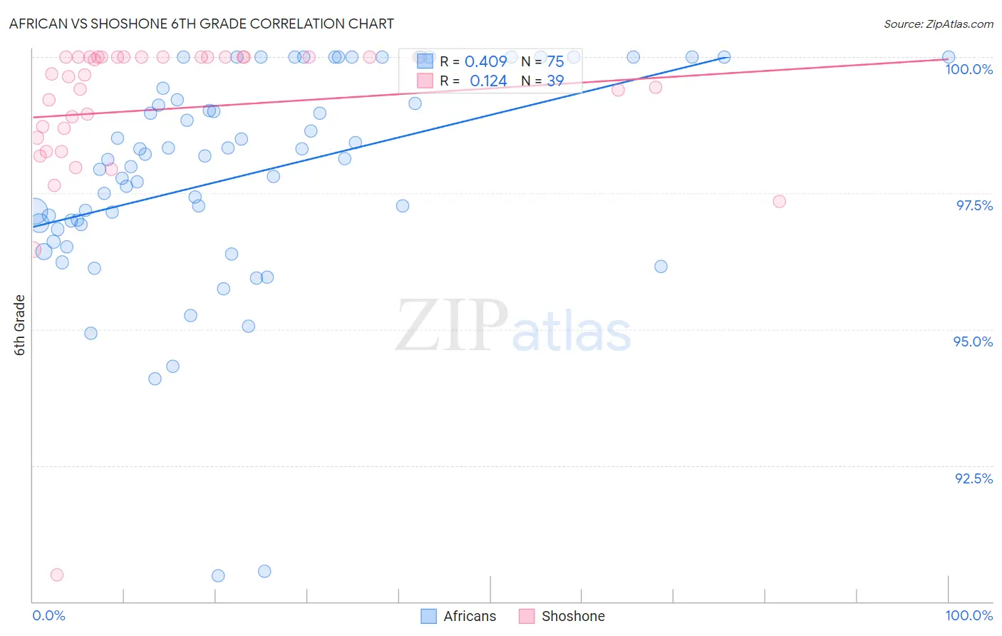 In terms of 6th grade, the demographic groups most similar to Africans are Immigrants from Zaire (96.9%, a difference of 0.0%), Immigrants from Northern Africa (96.9%, a difference of 0.010%), Immigrants from Chile (96.8%, a difference of 0.010%), Sudanese (96.8%, a difference of 0.010%), and Immigrants from Bahamas (96.8%, a difference of 0.010%).