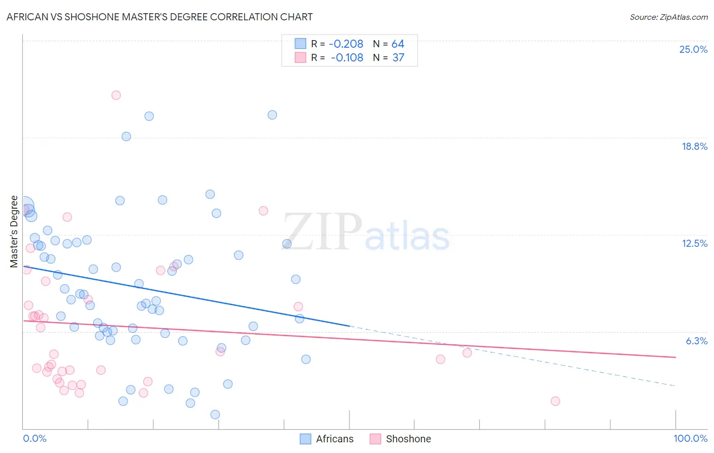 The statistical analysis conducted on geographies consisting of 469,751,464 people shows a weak negative correlation between the proportion of Africans and percentage of population with at least master's degree education in the United States with a correlation coefficient (R) of -0.208 and weighted average of 12.9%. Similarly, the statistical analysis conducted on geographies consisting of 66,620,223 people shows a poor negative correlation between the proportion of Shoshone and percentage of population with at least master's degree education in the United States with a correlation coefficient (R) of -0.108 and weighted average of 11.1%, a difference of 16.1%.