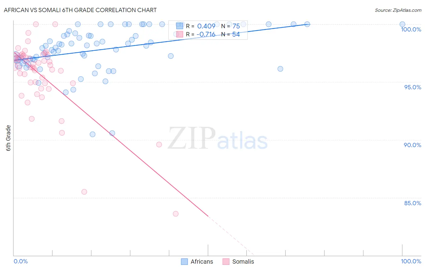 In terms of 6th grade, the demographic groups most similar to Africans are Immigrants from Zaire (96.9%, a difference of 0.0%), Immigrants from Northern Africa (96.9%, a difference of 0.010%), Immigrants from Chile (96.8%, a difference of 0.010%), Sudanese (96.8%, a difference of 0.010%), and Immigrants from Bahamas (96.8%, a difference of 0.010%).