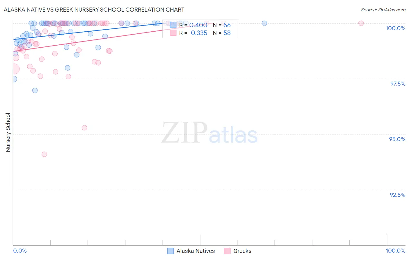 In terms of nursery school, the demographic groups most similar to Greeks are New Zealander (98.4%, a difference of 0.0%), Creek (98.4%, a difference of 0.0%), Immigrants from North America (98.4%, a difference of 0.0%), Maltese (98.4%, a difference of 0.0%), and Austrian (98.4%, a difference of 0.010%).