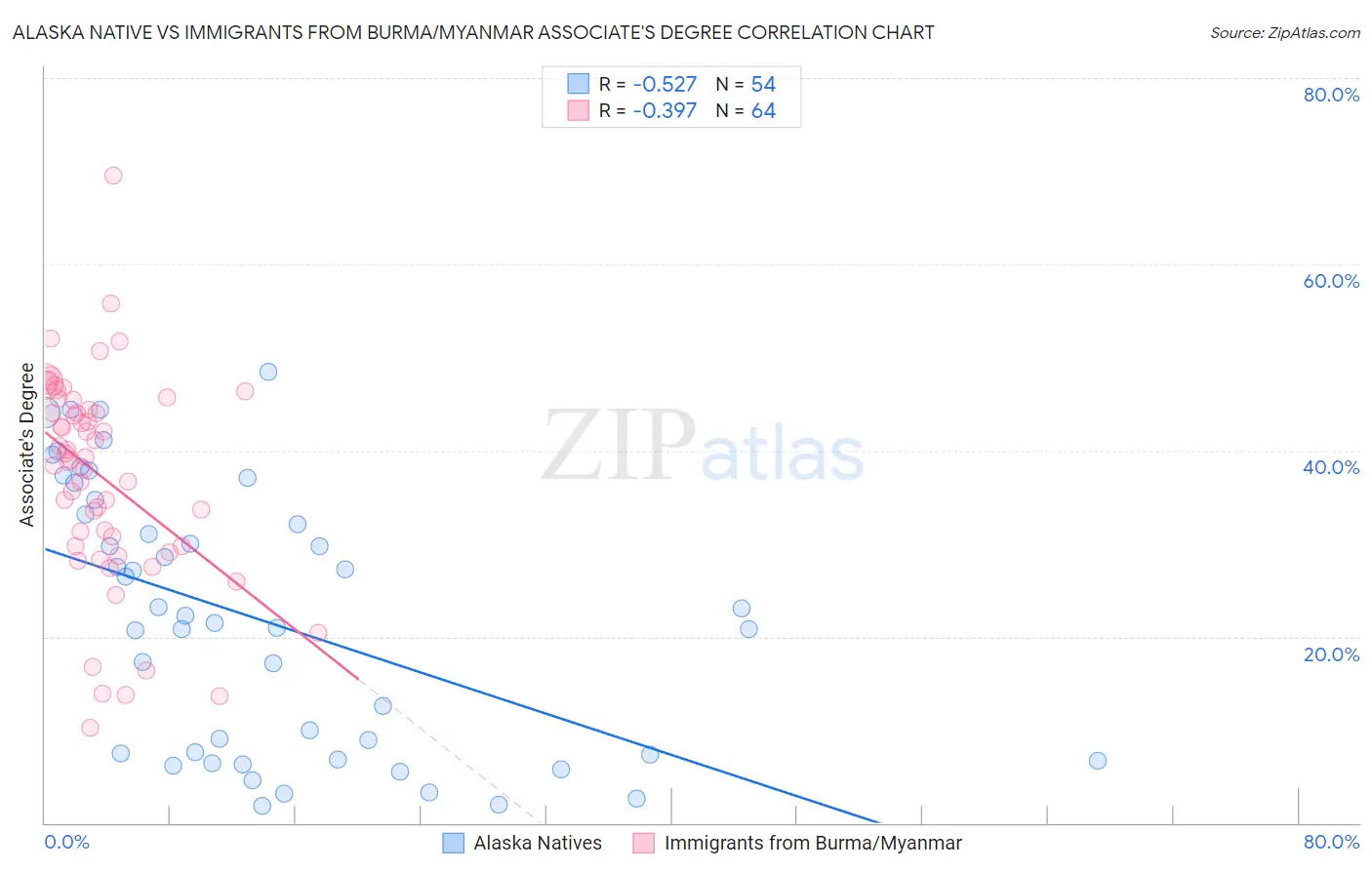 Alaska Native vs Immigrants from Burma/Myanmar Associate's Degree Correlation Chart