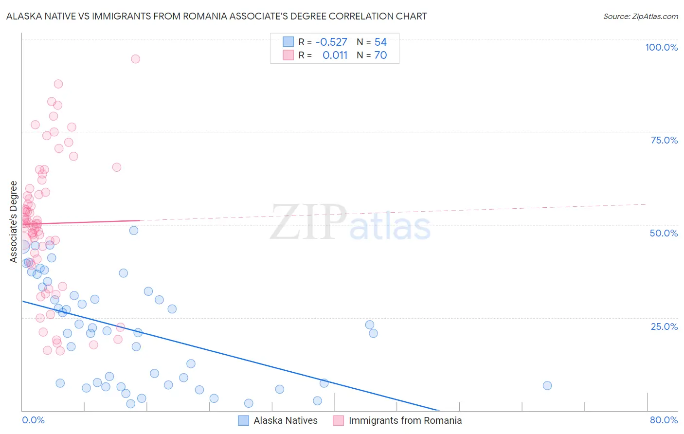Alaska Native vs Immigrants from Romania Associate's Degree Correlation Chart
