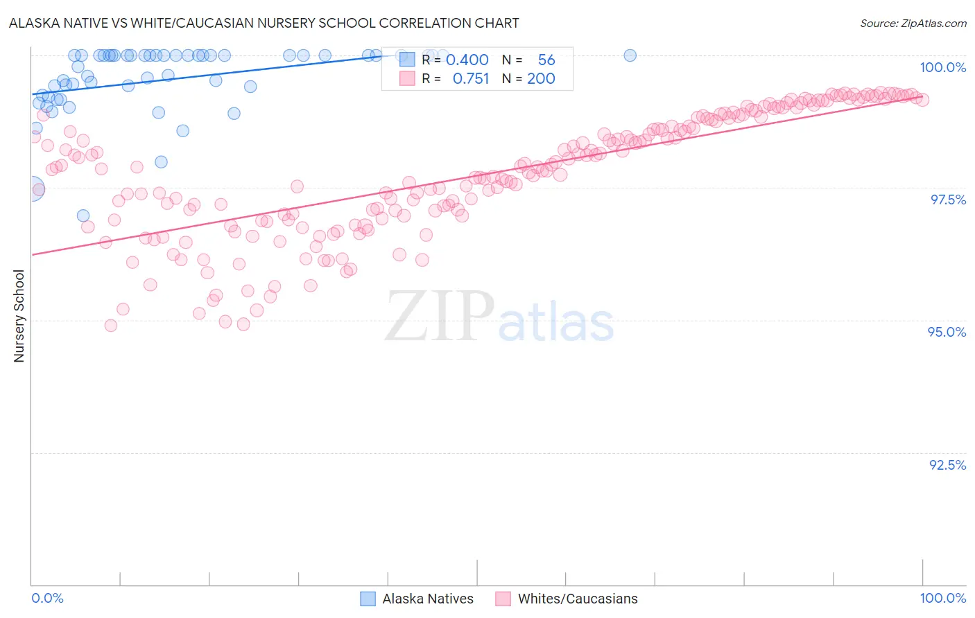 Alaska Native vs White/Caucasian Nursery School Correlation Chart