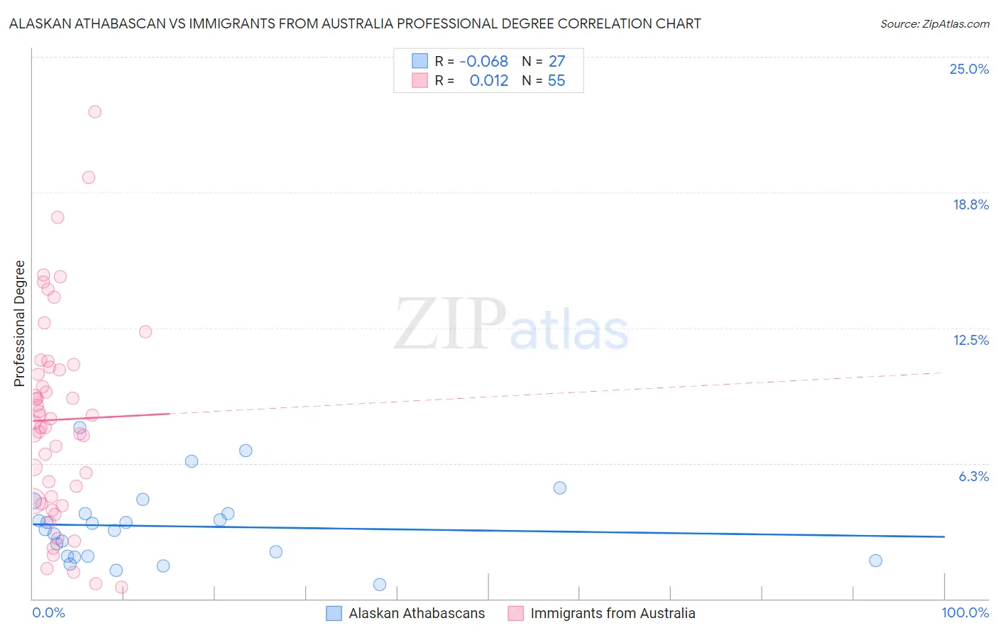 Alaskan Athabascan vs Immigrants from Australia Professional Degree Correlation Chart