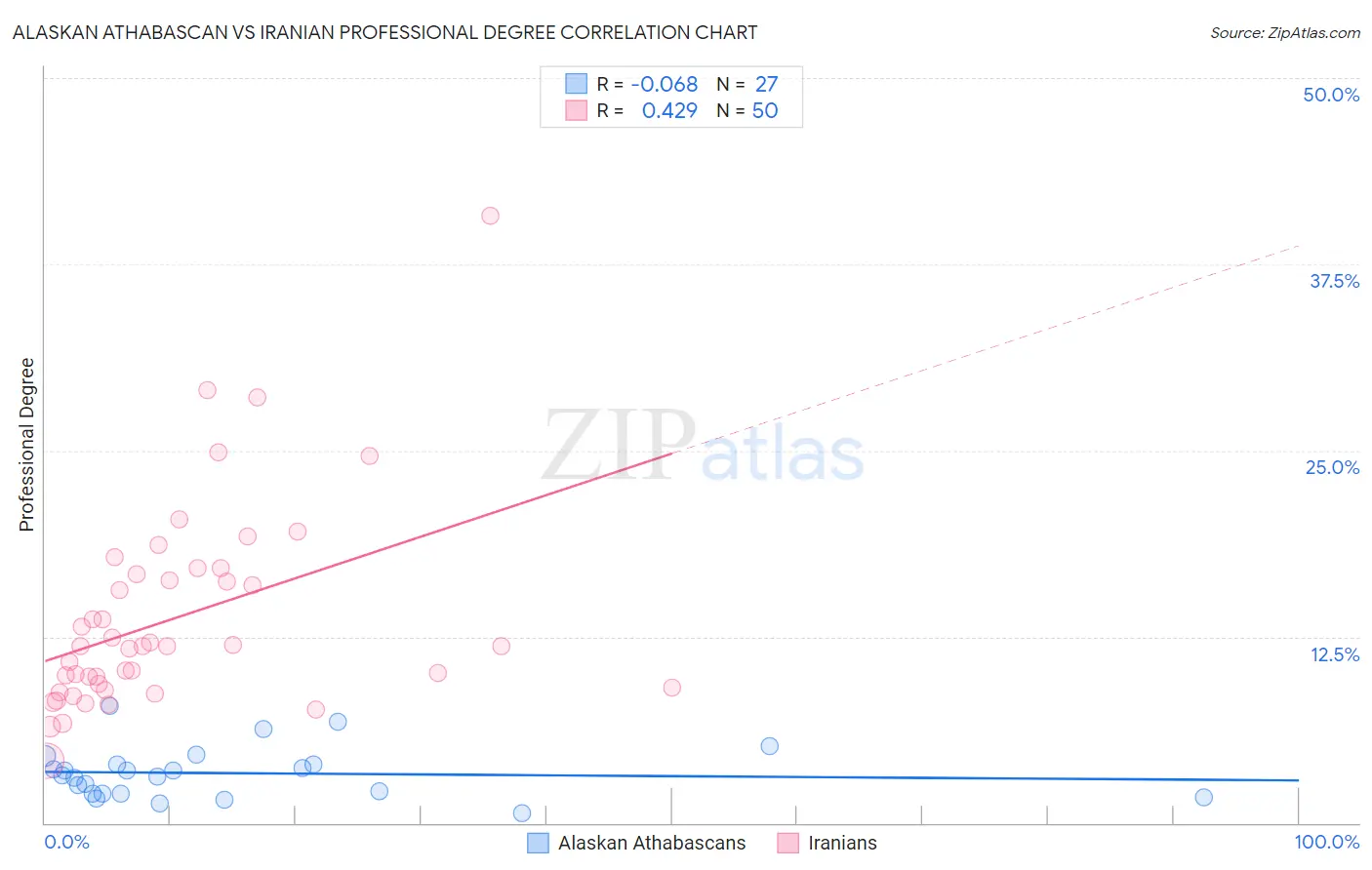 The statistical analysis conducted on geographies consisting of 45,732,326 people shows a slight negative correlation between the proportion of Alaskan Athabascans and percentage of population with at least professional degree education in the United States with a correlation coefficient (R) of -0.068 and weighted average of 3.8%. Similarly, the statistical analysis conducted on geographies consisting of 316,586,125 people shows a moderate positive correlation between the proportion of Iranians and percentage of population with at least professional degree education in the United States with a correlation coefficient (R) of 0.429 and weighted average of 7.6%, a difference of 100.3%.