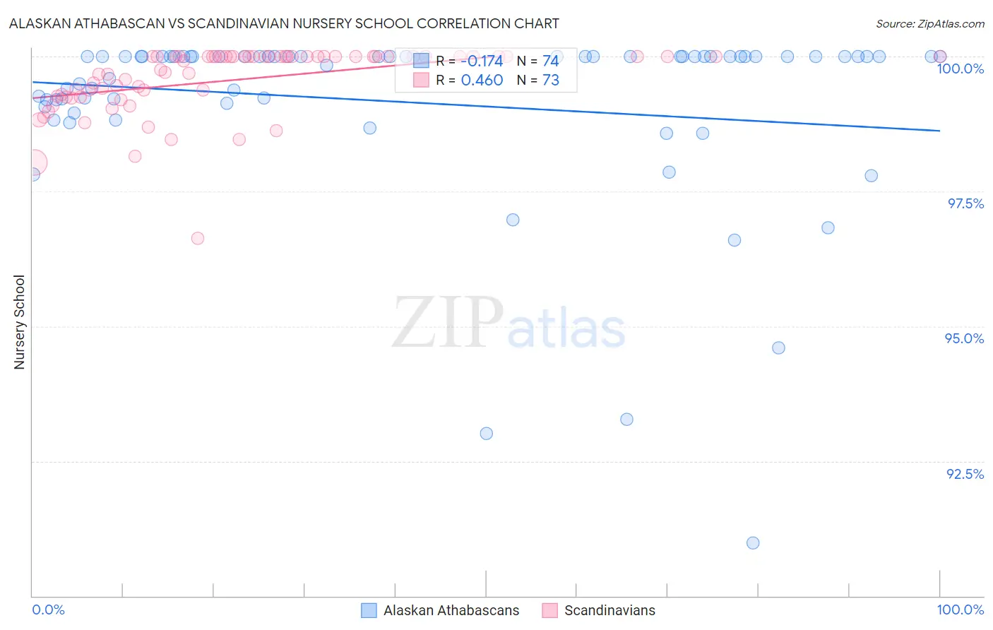 In terms of nursery school, the demographic groups most similar to Alaskan Athabascans are Alaska Native (98.8%, a difference of 0.030%), Norwegian (98.7%, a difference of 0.060%), Tsimshian (98.9%, a difference of 0.070%), Slovak (98.7%, a difference of 0.070%), and German (98.7%, a difference of 0.070%).