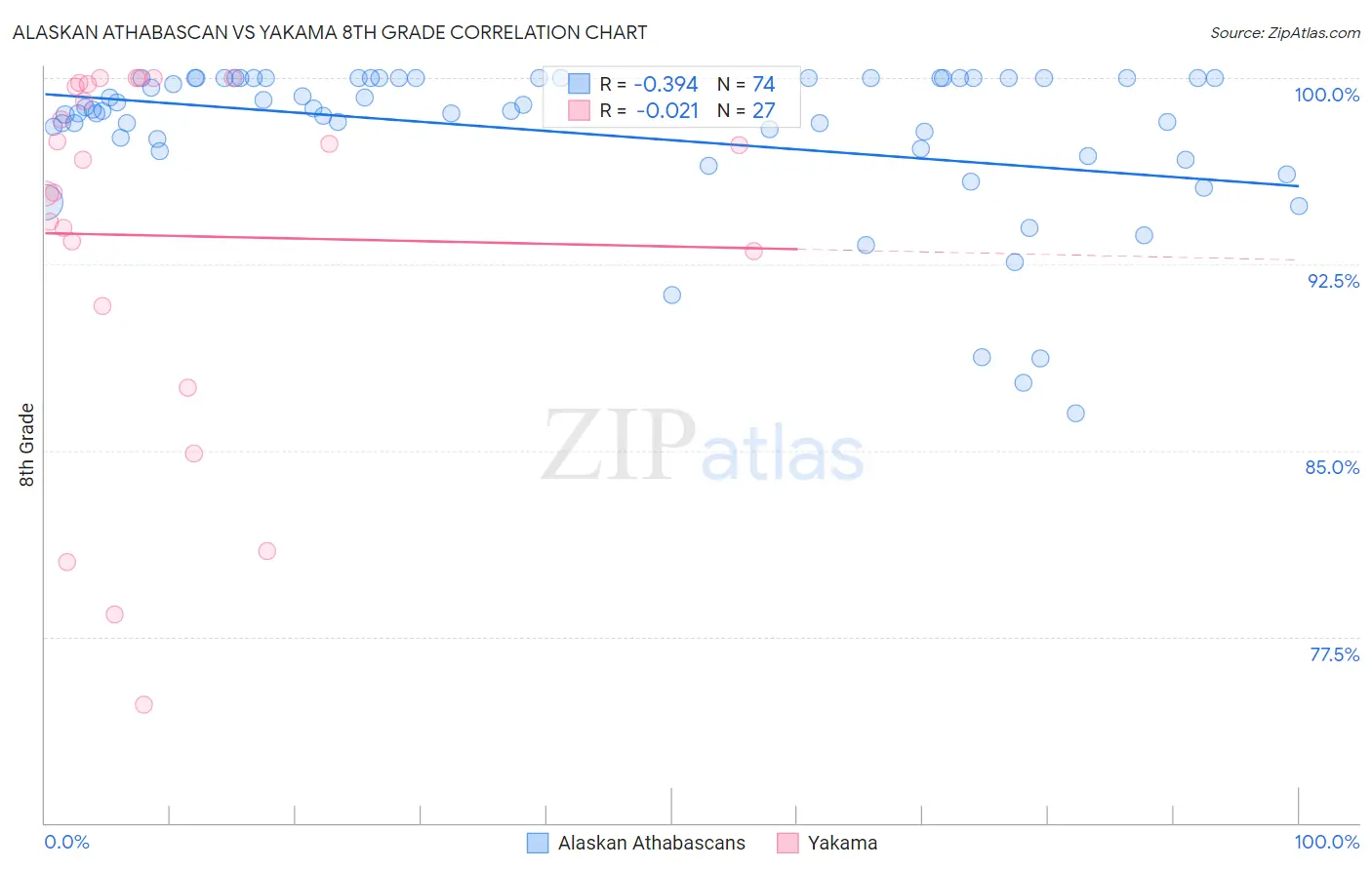 The statistical analysis conducted on geographies consisting of 45,820,365 people shows a mild negative correlation between the proportion of Alaskan Athabascans and percentage of population with at least 8th grade education in the United States with a correlation coefficient (R) of -0.394 and weighted average of 97.3%. Similarly, the statistical analysis conducted on geographies consisting of 19,923,144 people shows no correlation between the proportion of Yakama and percentage of population with at least 8th grade education in the United States with a correlation coefficient (R) of -0.021 and weighted average of 91.2%, a difference of 6.7%.