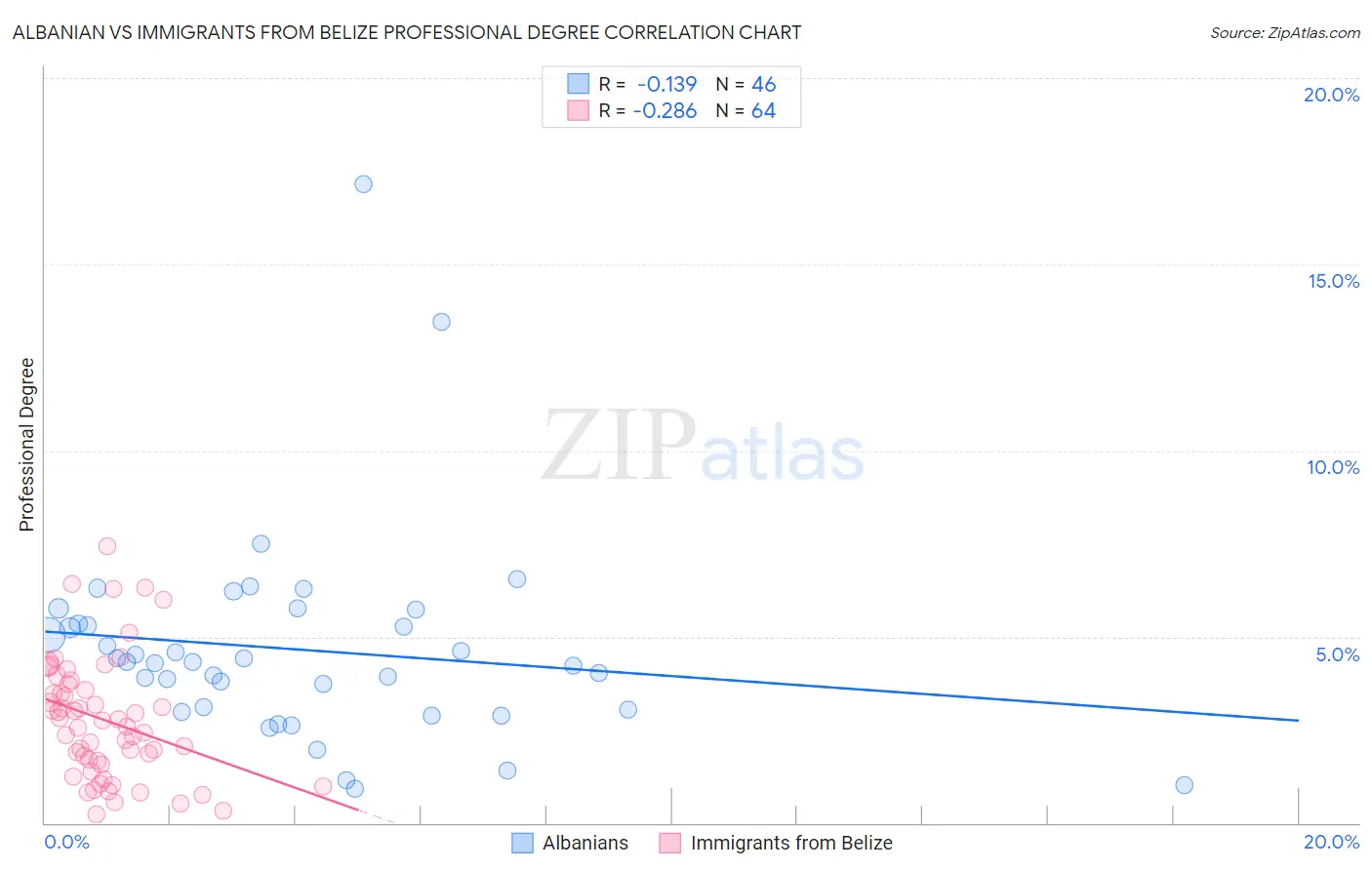 Albanian vs Immigrants from Belize Professional Degree Correlation Chart