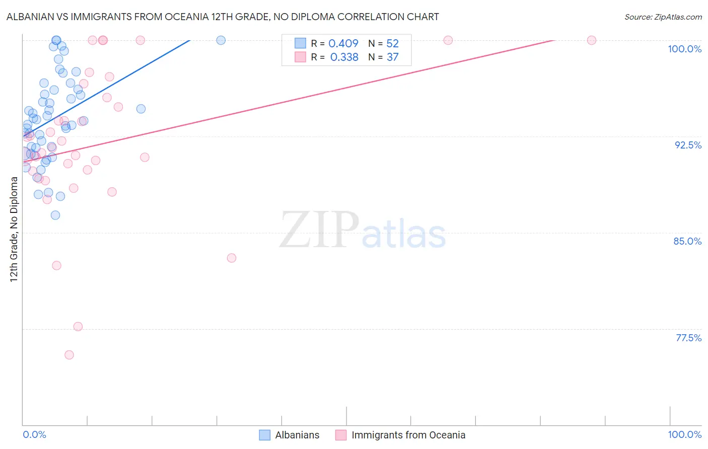 Albanian vs Immigrants from Oceania 12th Grade, No Diploma Correlation Chart