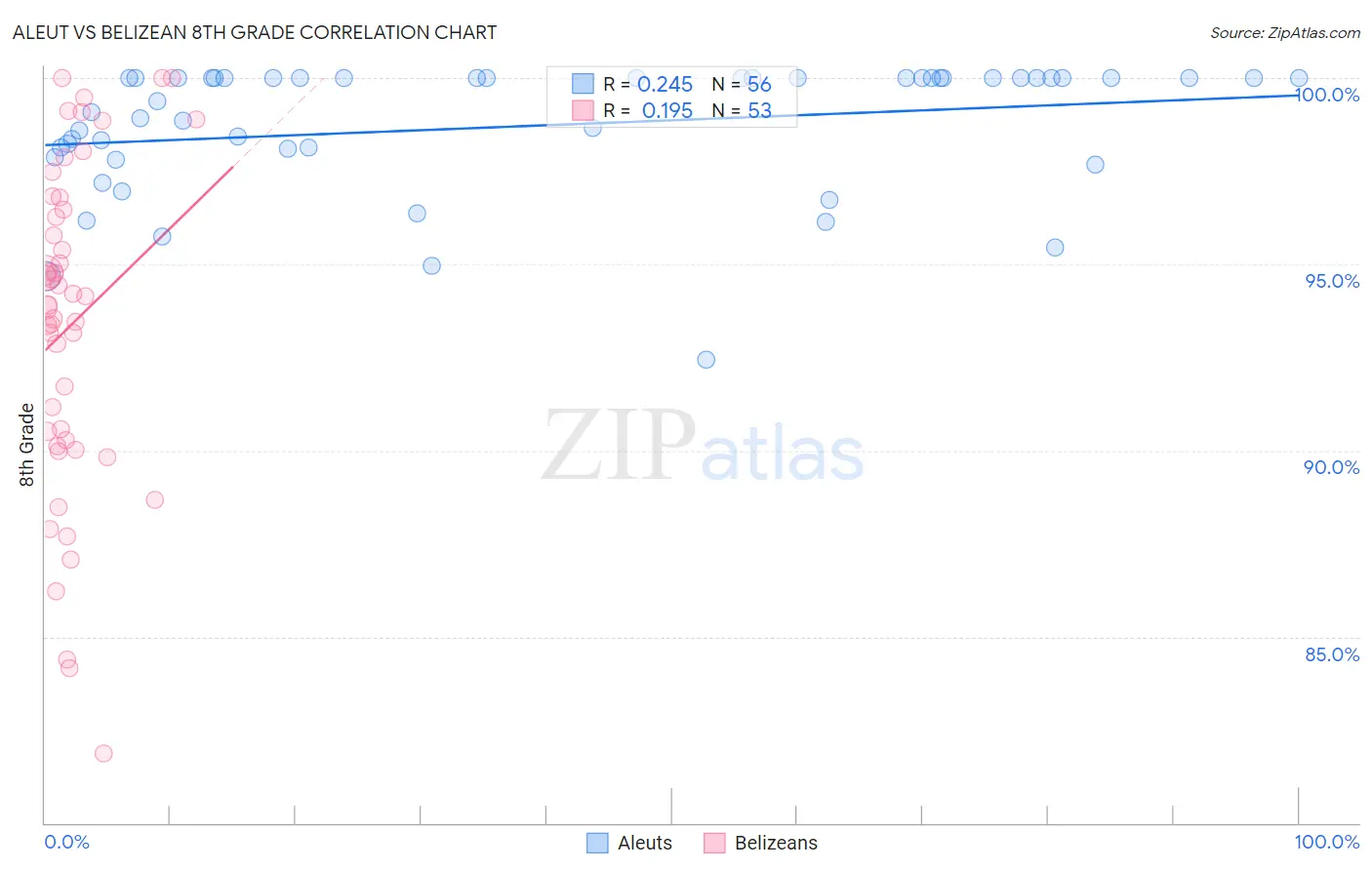 The statistical analysis conducted on geographies consisting of 61,780,964 people shows a weak positive correlation between the proportion of Aleuts and percentage of population with at least 8th grade education in the United States with a correlation coefficient (R) of 0.245 and weighted average of 96.9%. Similarly, the statistical analysis conducted on geographies consisting of 144,138,333 people shows a poor positive correlation between the proportion of Belizeans and percentage of population with at least 8th grade education in the United States with a correlation coefficient (R) of 0.195 and weighted average of 93.1%, a difference of 4.1%.