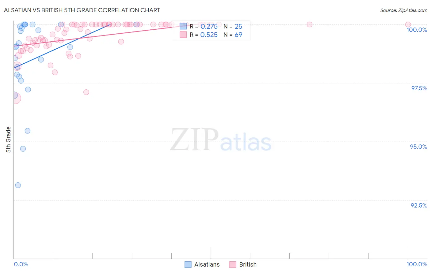 In terms of 5th grade, the demographic groups most similar to Alsatians are Immigrants from Eastern Europe (97.4%, a difference of 0.0%), Ute (97.4%, a difference of 0.0%), Immigrants from South Central Asia (97.5%, a difference of 0.020%), Immigrants from Russia (97.4%, a difference of 0.020%), and Immigrants from Bosnia and Herzegovina (97.4%, a difference of 0.020%).