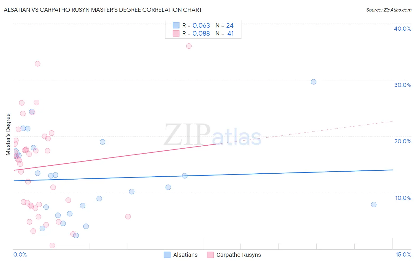 The statistical analysis conducted on geographies consisting of 82,679,386 people shows a slight positive correlation between the proportion of Alsatians and percentage of population with at least master's degree education in the United States with a correlation coefficient (R) of 0.063 and weighted average of 16.9%. Similarly, the statistical analysis conducted on geographies consisting of 58,870,133 people shows a slight positive correlation between the proportion of Carpatho Rusyns and percentage of population with at least master's degree education in the United States with a correlation coefficient (R) of 0.088 and weighted average of 17.5%, a difference of 3.7%.