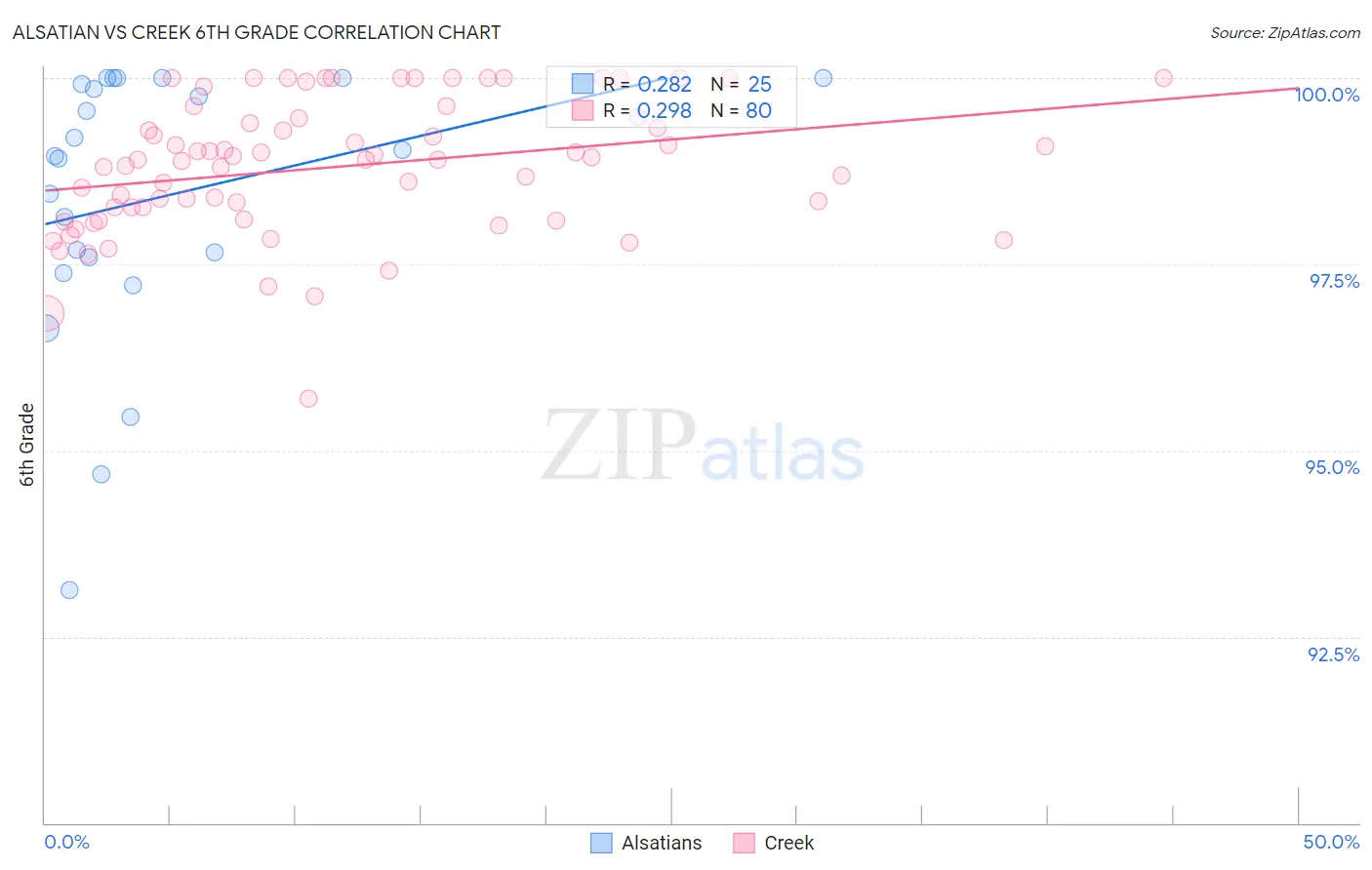 In terms of 6th grade, the demographic groups most similar to Creek are Aleut (97.7%, a difference of 0.0%), Maltese (97.8%, a difference of 0.010%), Australian (97.8%, a difference of 0.010%), Slavic (97.8%, a difference of 0.010%), and Austrian (97.7%, a difference of 0.010%).