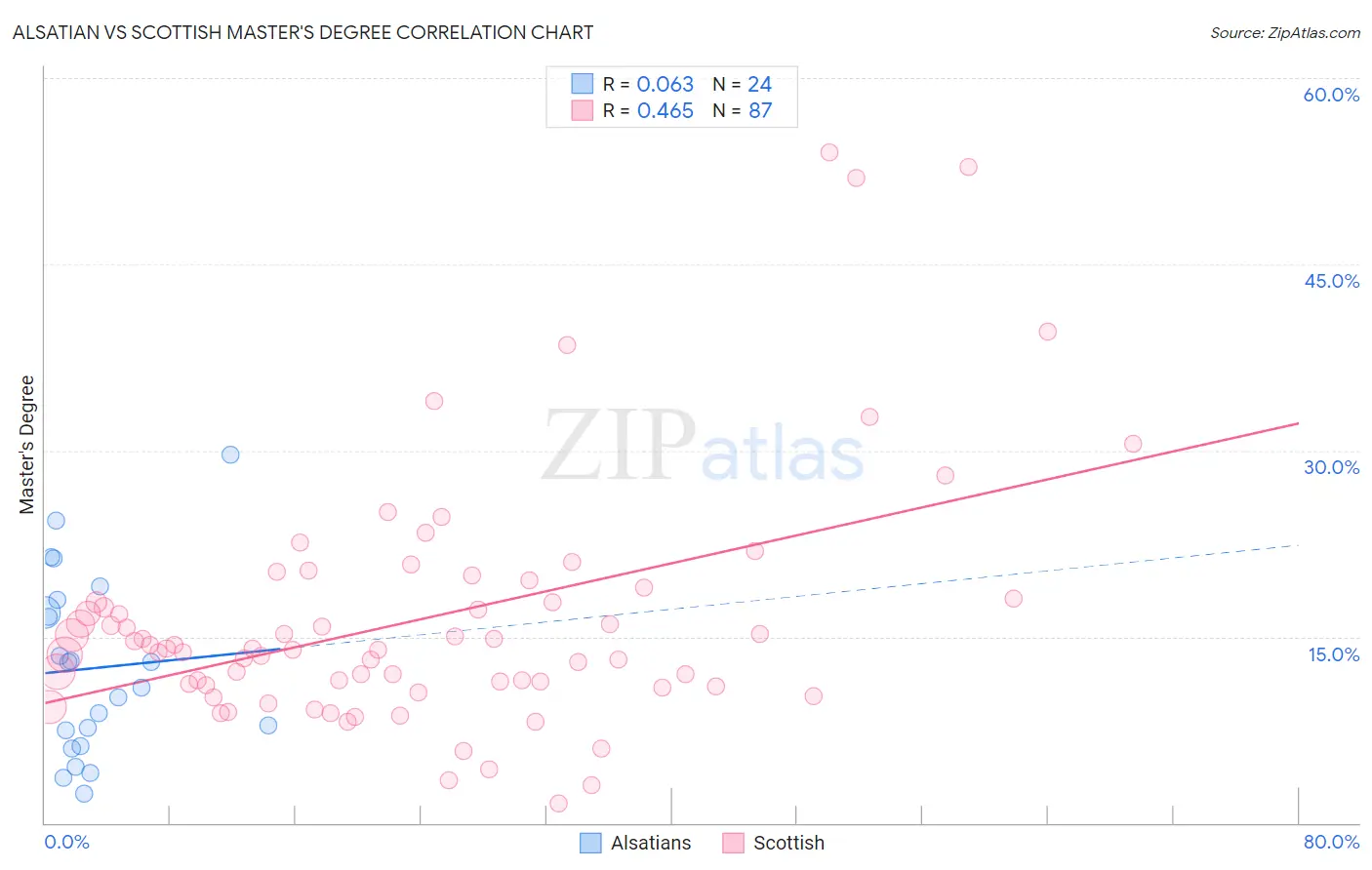 The statistical analysis conducted on geographies consisting of 82,679,386 people shows a slight positive correlation between the proportion of Alsatians and percentage of population with at least master's degree education in the United States with a correlation coefficient (R) of 0.063 and weighted average of 16.9%. Similarly, the statistical analysis conducted on geographies consisting of 566,344,578 people shows a moderate positive correlation between the proportion of Scottish and percentage of population with at least master's degree education in the United States with a correlation coefficient (R) of 0.465 and weighted average of 15.2%, a difference of 11.3%.