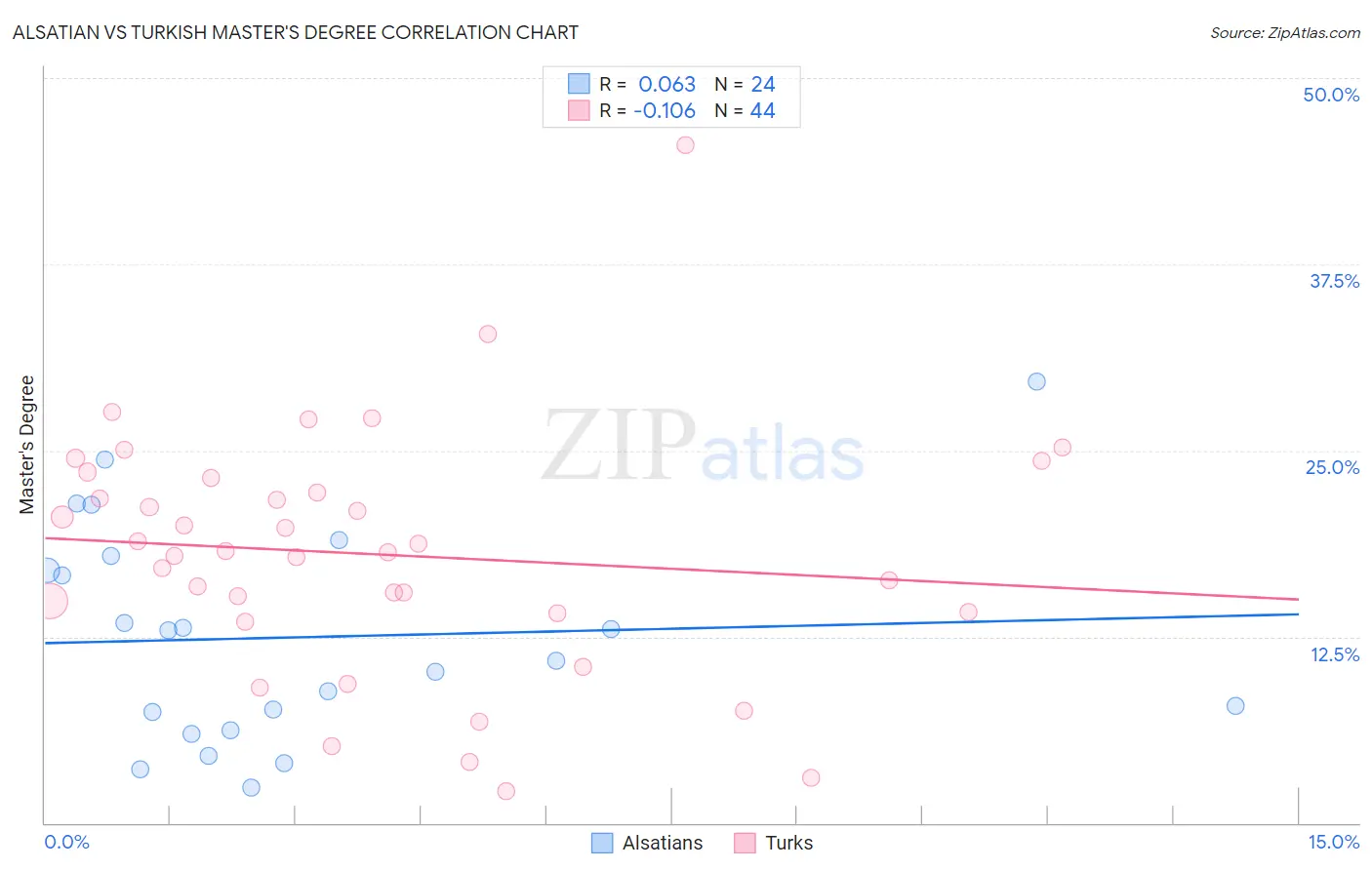 The statistical analysis conducted on geographies consisting of 82,679,386 people shows a slight positive correlation between the proportion of Alsatians and percentage of population with at least master's degree education in the United States with a correlation coefficient (R) of 0.063 and weighted average of 16.9%. Similarly, the statistical analysis conducted on geographies consisting of 271,799,708 people shows a poor negative correlation between the proportion of Turks and percentage of population with at least master's degree education in the United States with a correlation coefficient (R) of -0.106 and weighted average of 19.9%, a difference of 17.8%.